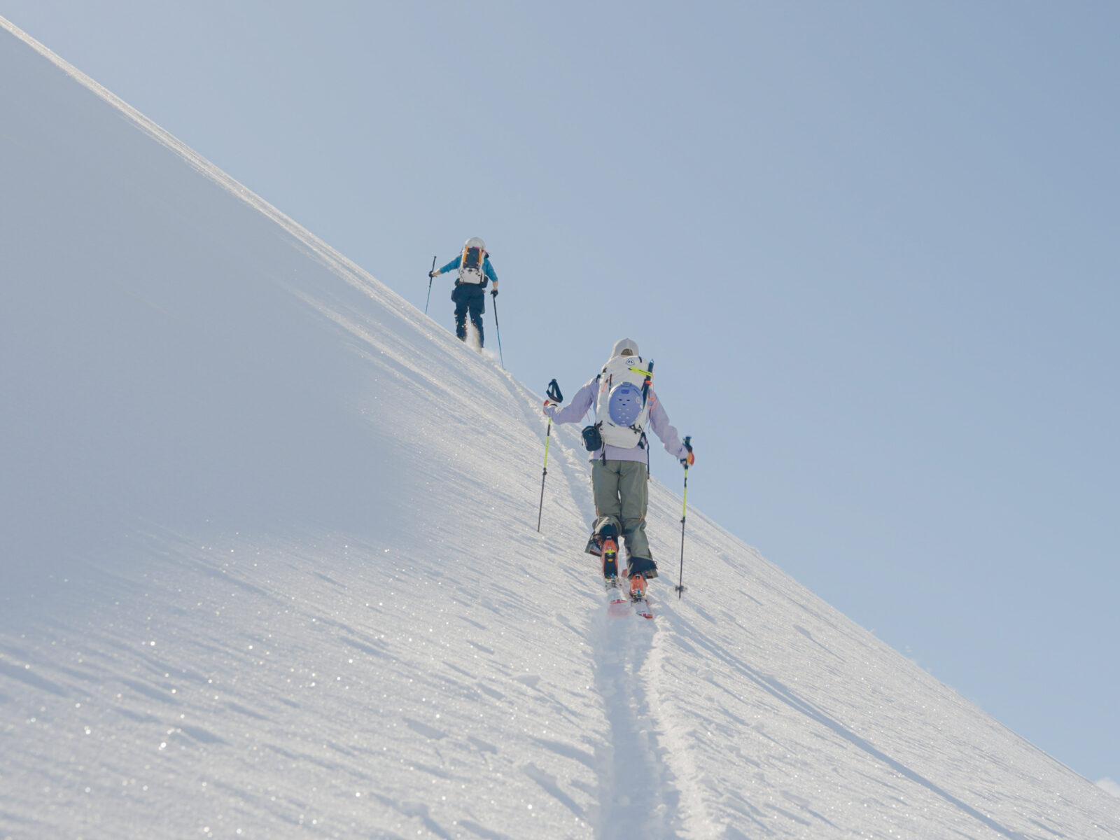 The Southwest Facing couloir receives a lot of solar exposure, so cold, stable and clear days are what you should be aiming for. The couloir’s V-Shape collects and accelerates any slough or avalanches, so being hyper aware of slough management is crucial to a safe descent. It’s 40-45º pitch is playful yet steep enough to pay attention. Once you’re clear of the couloir, ski down the glacial carved valley to nearly the end of the valley. Tour back to the cat track, remove skins and ski, glide and skate back down the groomed track back to car.