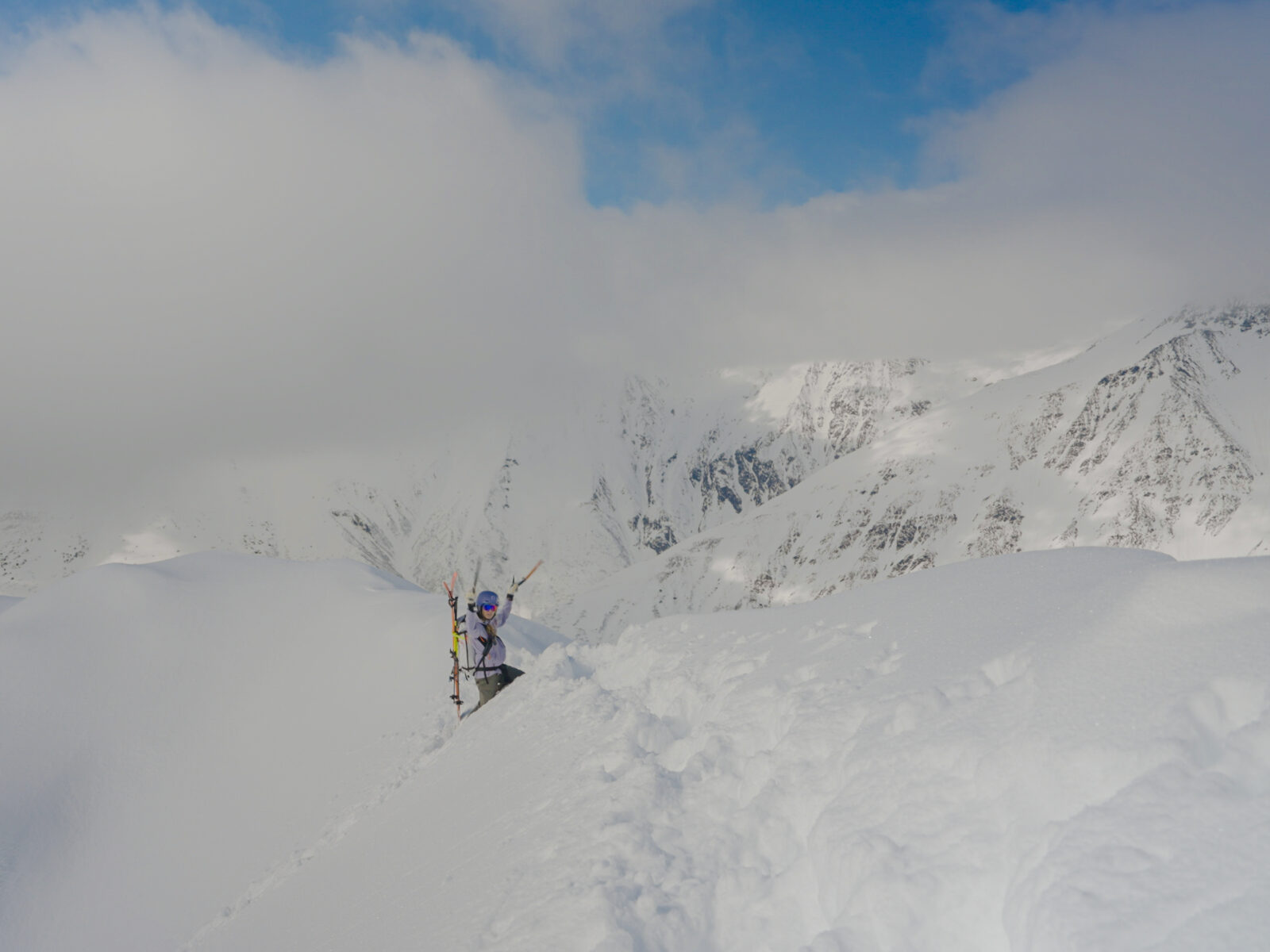 Starting from the trailhead parking lot at the end of Arberg Ave near the Alyeska Resort Hotel, it’s a 7 mile approach to reach the base of the couloir. The groomed cat track winds over Winner Creek and into the Sunspot Cat Skiing terrain. One more off trail contour through the valley below A1 peak leads into the valley of Northstar Couloir. A crucial decision on how to get to the base of the couloir is necessary as the north facing slopes opposing the Northstar Couloir are heavily cliffed, exposed and complex. The most sure way to get to the base is from below near Glacier Creek. Once you’re in the couloir, it’s a 1000 feet of straight up boot packing to the col.