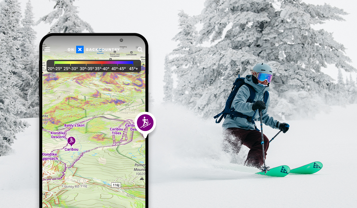 You can find low-angle terrain in onX Backcountry using the Slope Angle Layer, which shades your map based on slope angle. Keep an eye out for green and yellow slopes on your map when the Slope Angle layer is turned on—these colors signify slopes below 30 degrees. Keep in mind that you should always verify the slope angle with what you’re seeing on the ground. Ski with your head up, and don’t get lost in your phone.