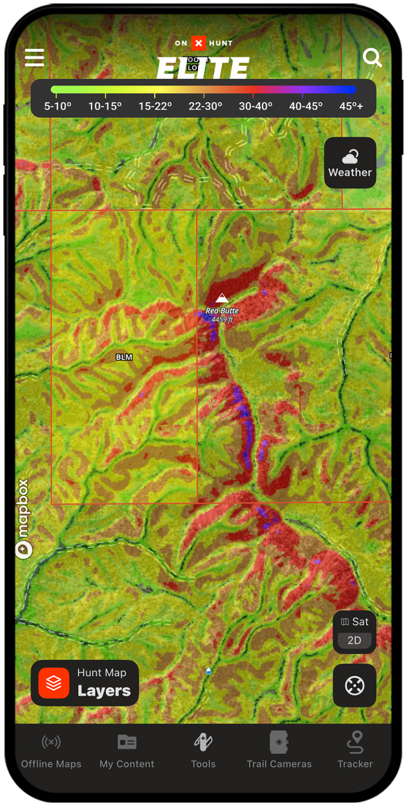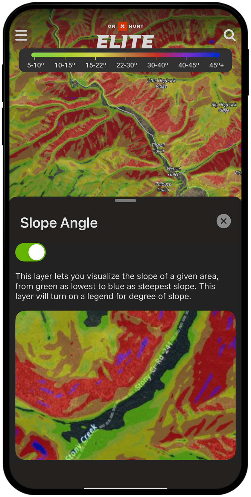 As someone who travels from sea level and flat land to hunt elk, knowing how rugged the terrain is where I’m heading into is of huge importance to me. Slope Angle is super handy for getting a quick idea of what to expect and determining how long it will take me to get from point A to point B.