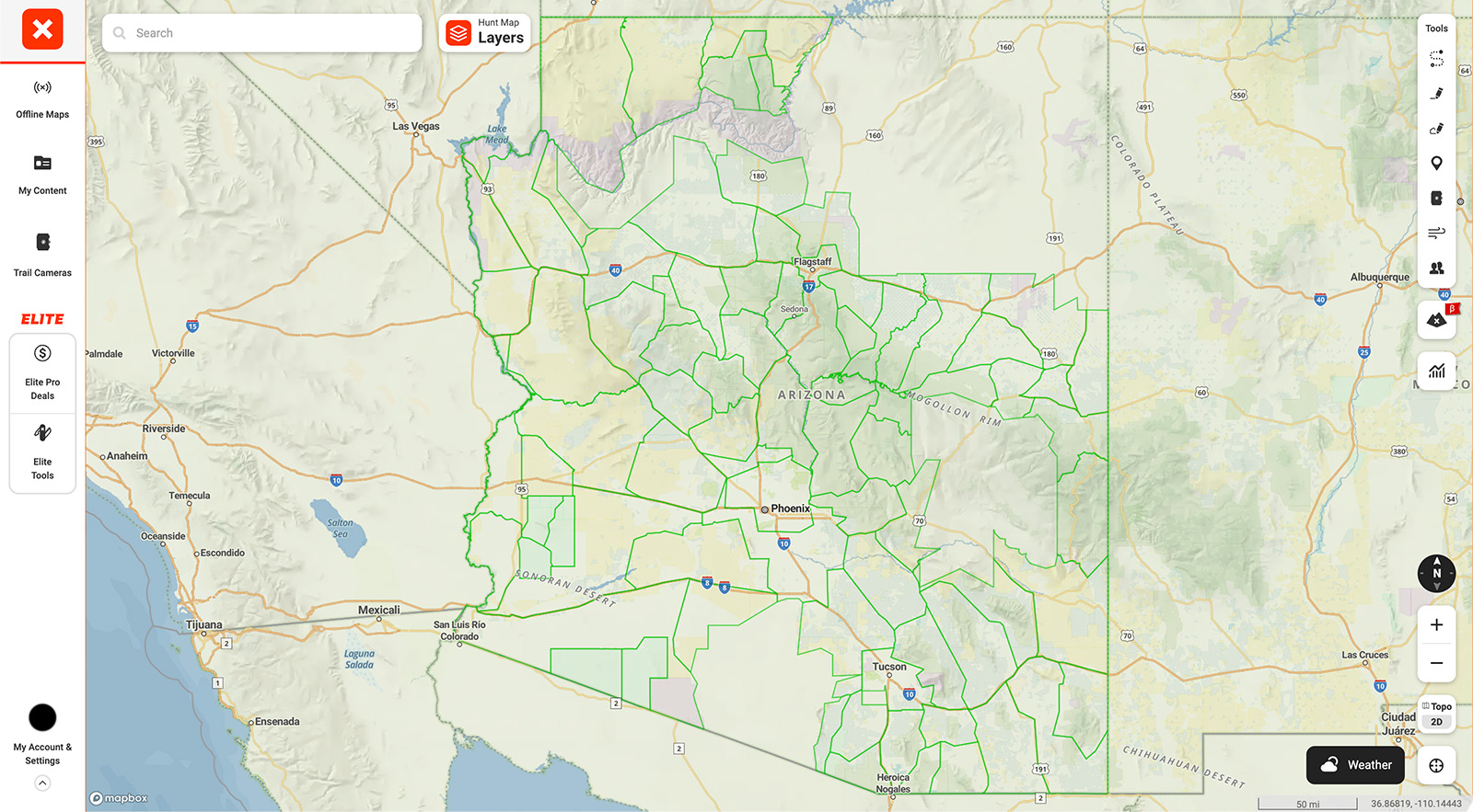 With over 70 different GMUs in Arizona, it can be hard to sift through them all to find where exactly you want to hunt. Use the onX Hunt App’s AZ GMUs Layer (pictured above) to visualize the boundaries of every hunting unit in Arizona. And, with the AZ Game Distribution Layer, you can select a certain species to see its distribution throughout the state. Then you can start e-scouting: mark Waypoints on potential areas to camp, identify road access, trails, and trailheads using your Roads, Trails, and Rec Layers, and assess where it’s legal and illegal to hunt using the AZ Private Lands Layer.