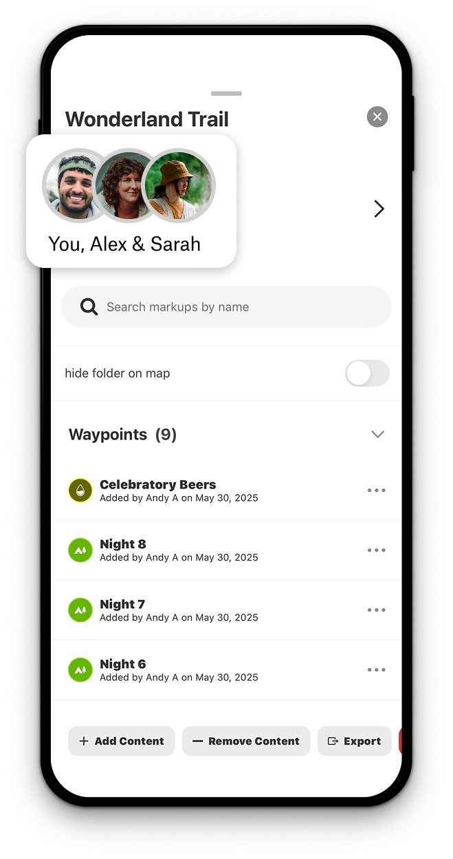 With Collaborative Folders, you can organize your markups by trip, then invite friends to add their own routes, campsites, or areas. It keeps the planning process clear, especially when you’re off-grid.