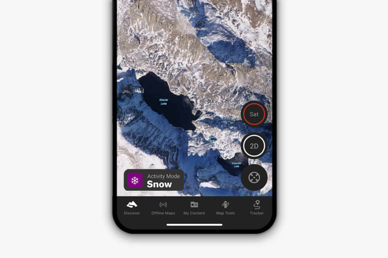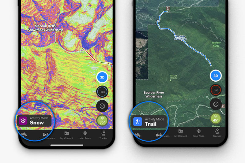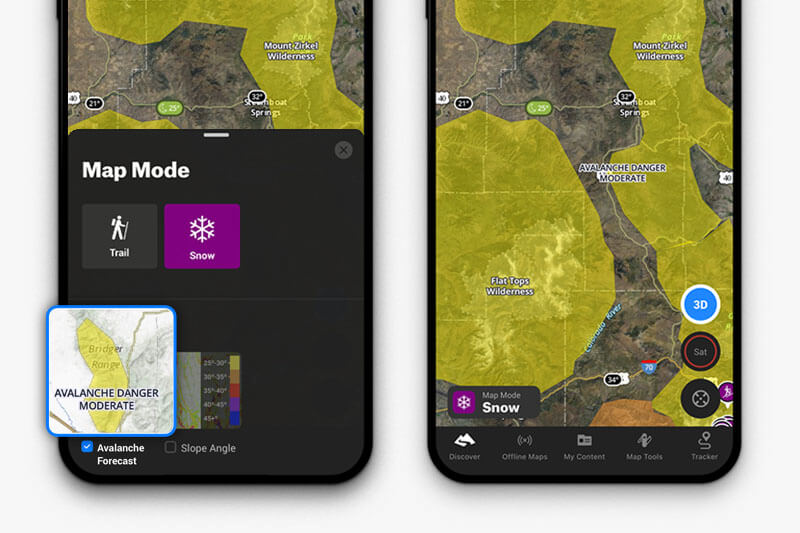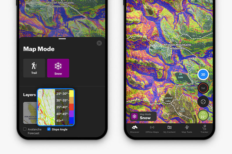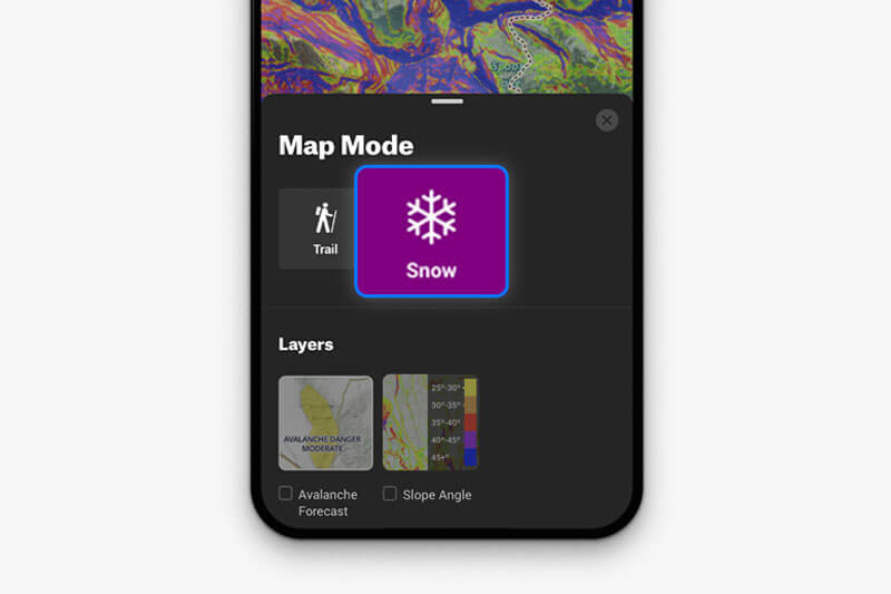 Snow Mode allows you to view ski touring, cross-country skiing, and snowshoe trails, along with slope angles, and avalanche forecasts. The goal of this mode is to put the tools you need at your fingertips to navigate through avalanche terrain and stay safe in the backcountry.