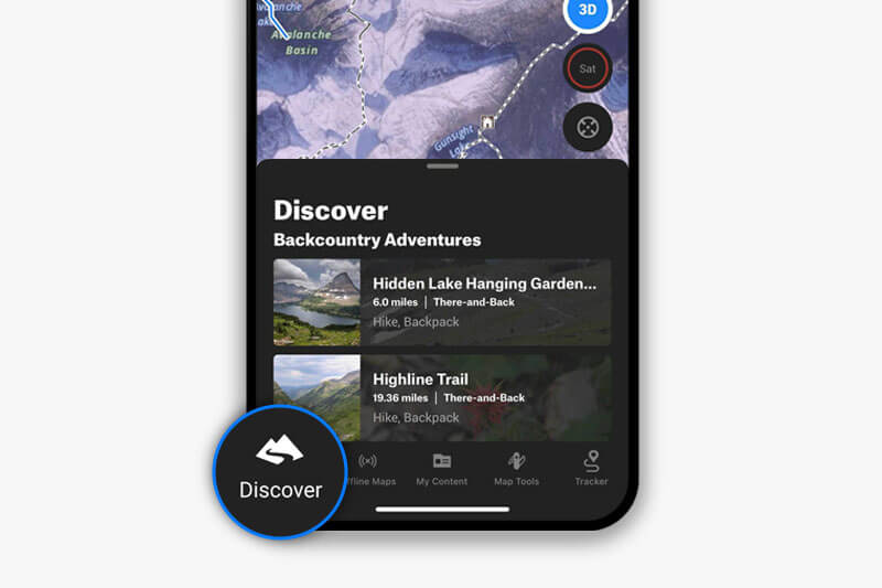 Tap the Discover button to view backcountry adventures with expert-curated information like detailed route descriptions, elevation profiles, photos, local weather, and more.