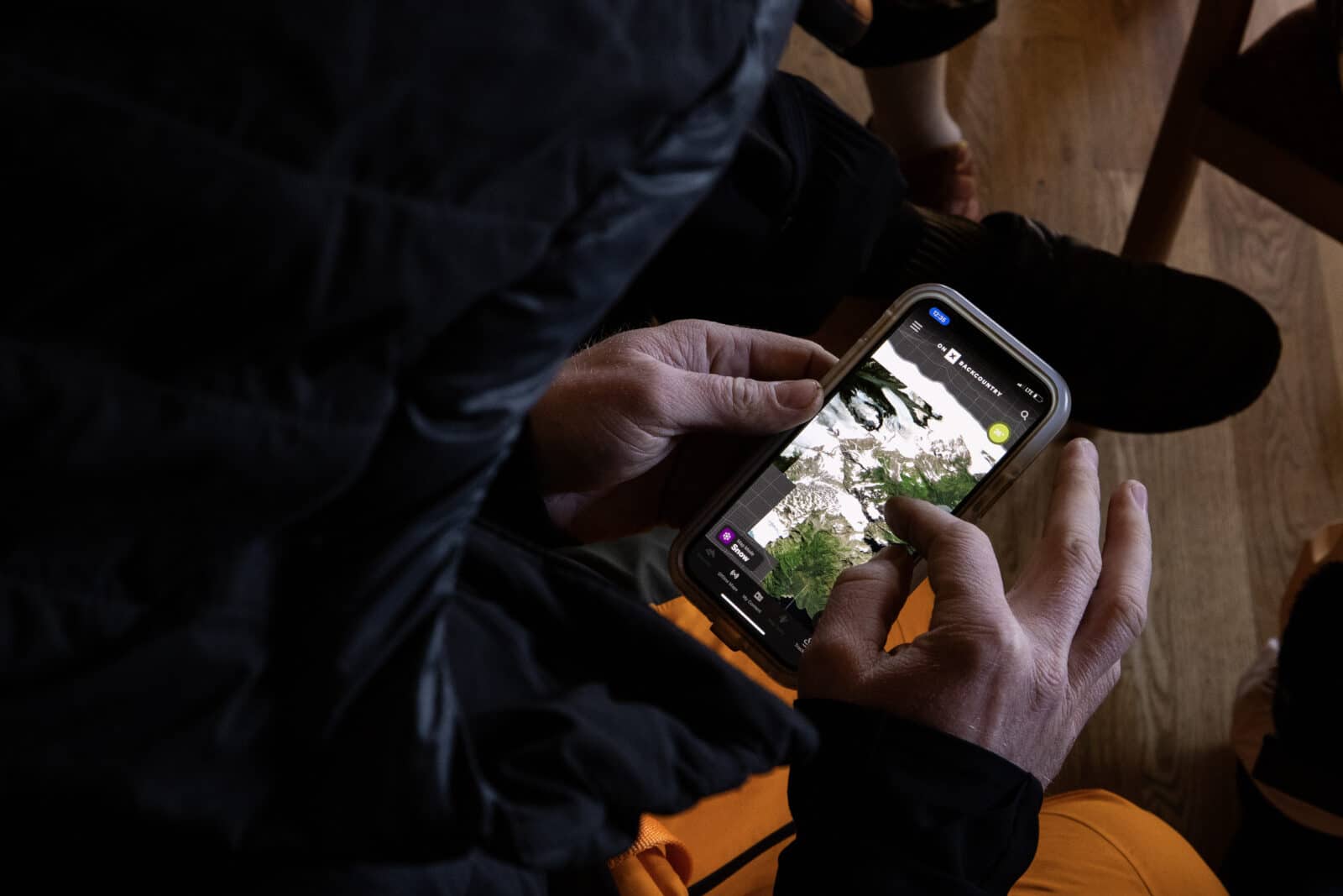 Using onX Backcountry, the crew was able to drop myriad Waypoints while in a helicopter during a scouting mission. The flurry of pin dropping didn’t lead to the most creative names, but identifiers like Square Top and Jagged Ridge combined with photos enabled them to do several things. The first was timing their shoots. Having seen the way the light hit a certain face at a given time the previous day, they were able to replicate that for an amazing shot the following. Additionally, things such as slope angle played a paramount role in being able to come up with backup options. “The beauty of onX is not just in its role as a primary navigator, but in its ability to house Plan B, C, and D. All of a sudden it becomes easy to have backups. Legwork on the front end can save weeks when you’re there,” says Post.