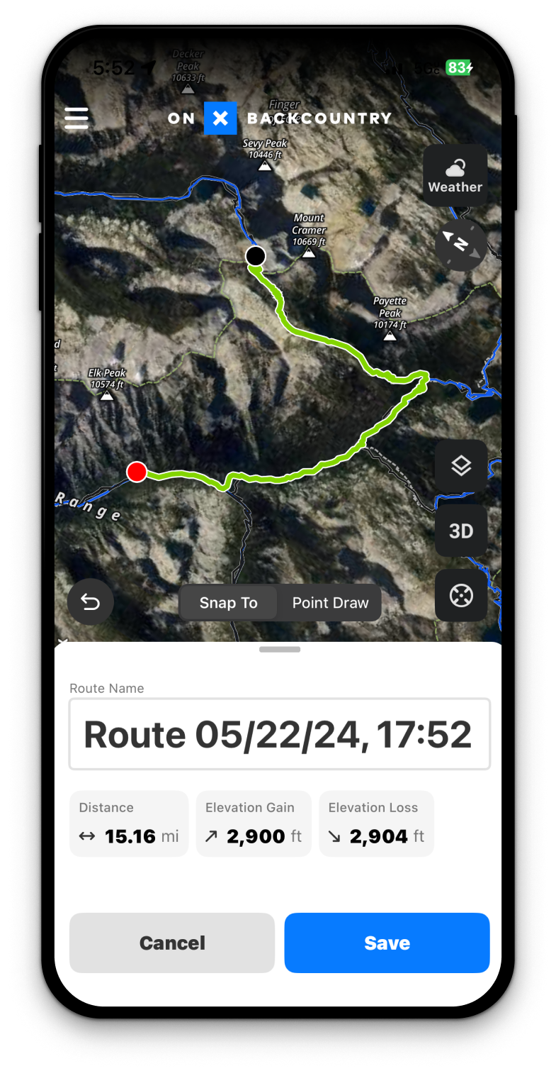 How-To: Select ‘Route Builder,’ choose Snap To for trails or Point for off-trail navigation.