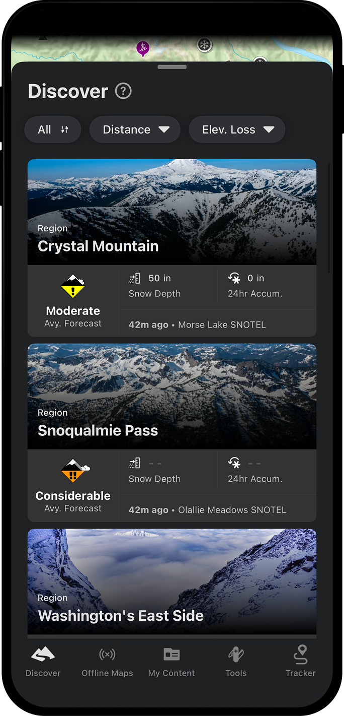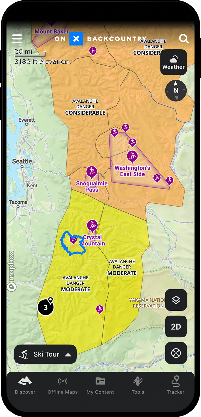 Be prepared before you head out on your next backcountry skiing adventure. View Avalanche Forecasts directly from the Northwest Avalanche Center and on-the-ground Snow Conditions from local SNOTEL stations. Read the full reports and observations, to make safer, more informed decisions with onX Backcountry.