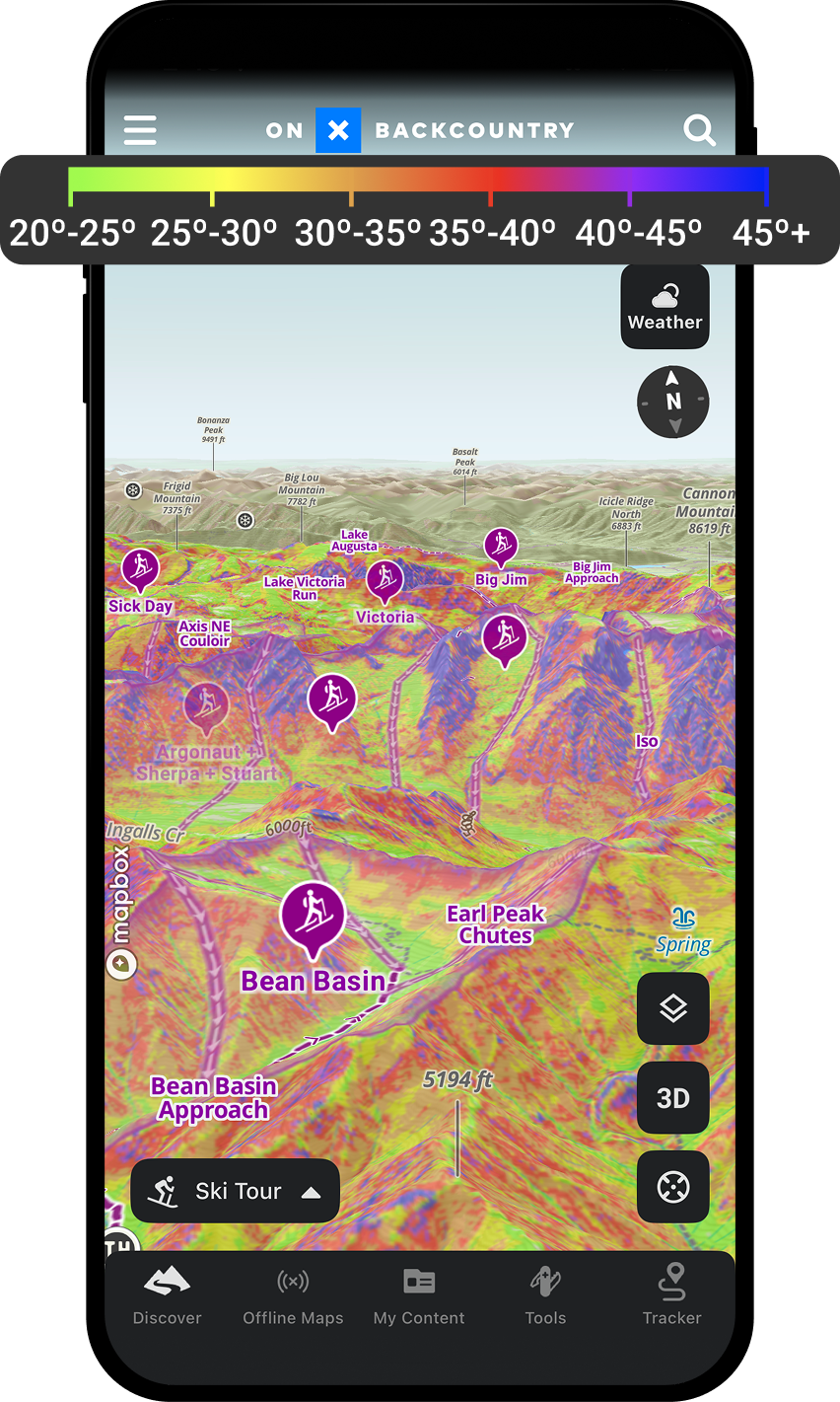 Make informed decisions before you drop in by using onX Backcountry’s Slope Aspect and Slope Angle Layers together. Identify the cardinal direction of the terrain with a color-coded compass to understand sun exposure and potential wind loading based on the avalanche forecast. Then, evaluate slope steepness with detailed, color-coded angle data to better assess avalanche risk and choose safer routes. Explore the map to see how these layers work together and plan your next tour with confidence.