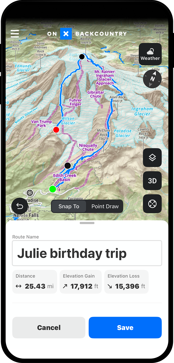 onX Backcountry has partnered with Beacon Guidebooks to provide unparalleled access to popular Washington backcountry ski routes. With detailed route descriptions, elevation profiles, and the ability to view landscapes in 3D, satellite, topographic maps, or our Hybrid Basemap, identify your next adventure with ease.
