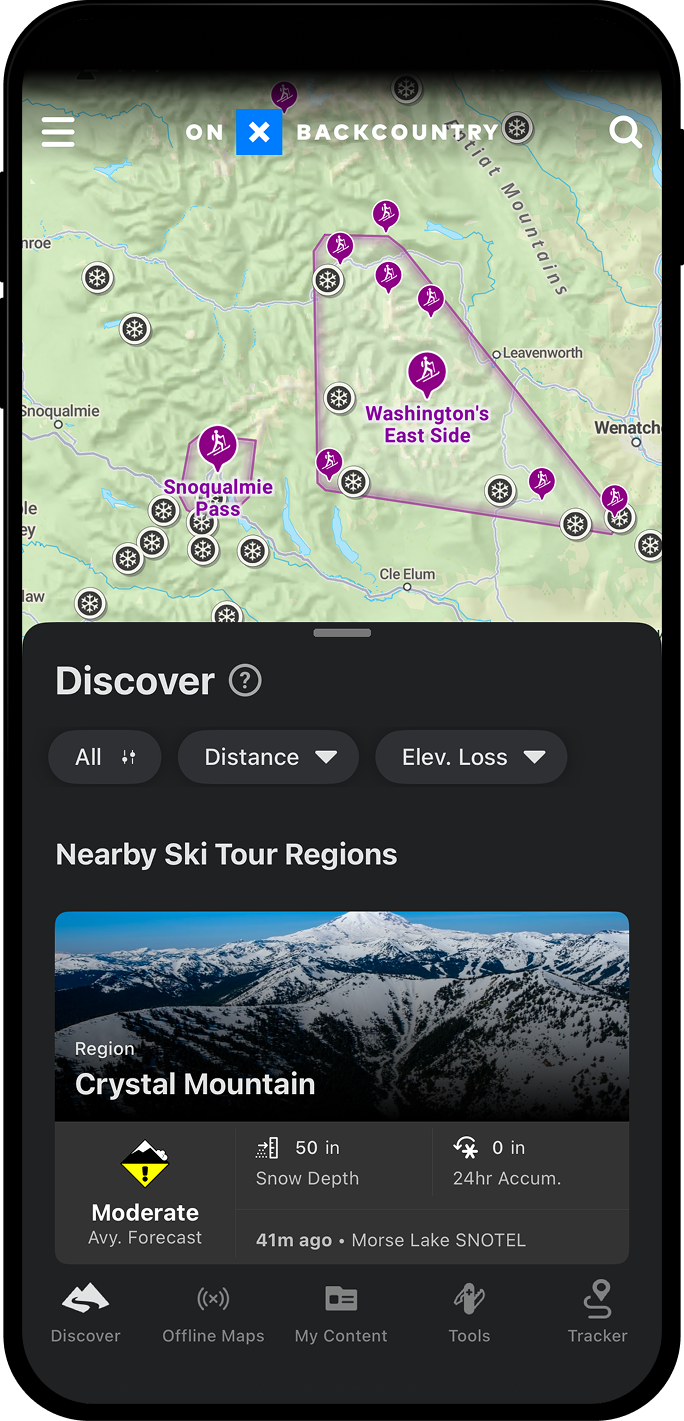 Is backcountry skiing in Washington on your winter to-do list? The onX Backcountry App includes ski maps, route descriptions, ratings, and more, including popular backcountry ski destinations such as Crystal Mountain, Snoqualmie Pass, Mount Baker, Olympic National Park, and much more.