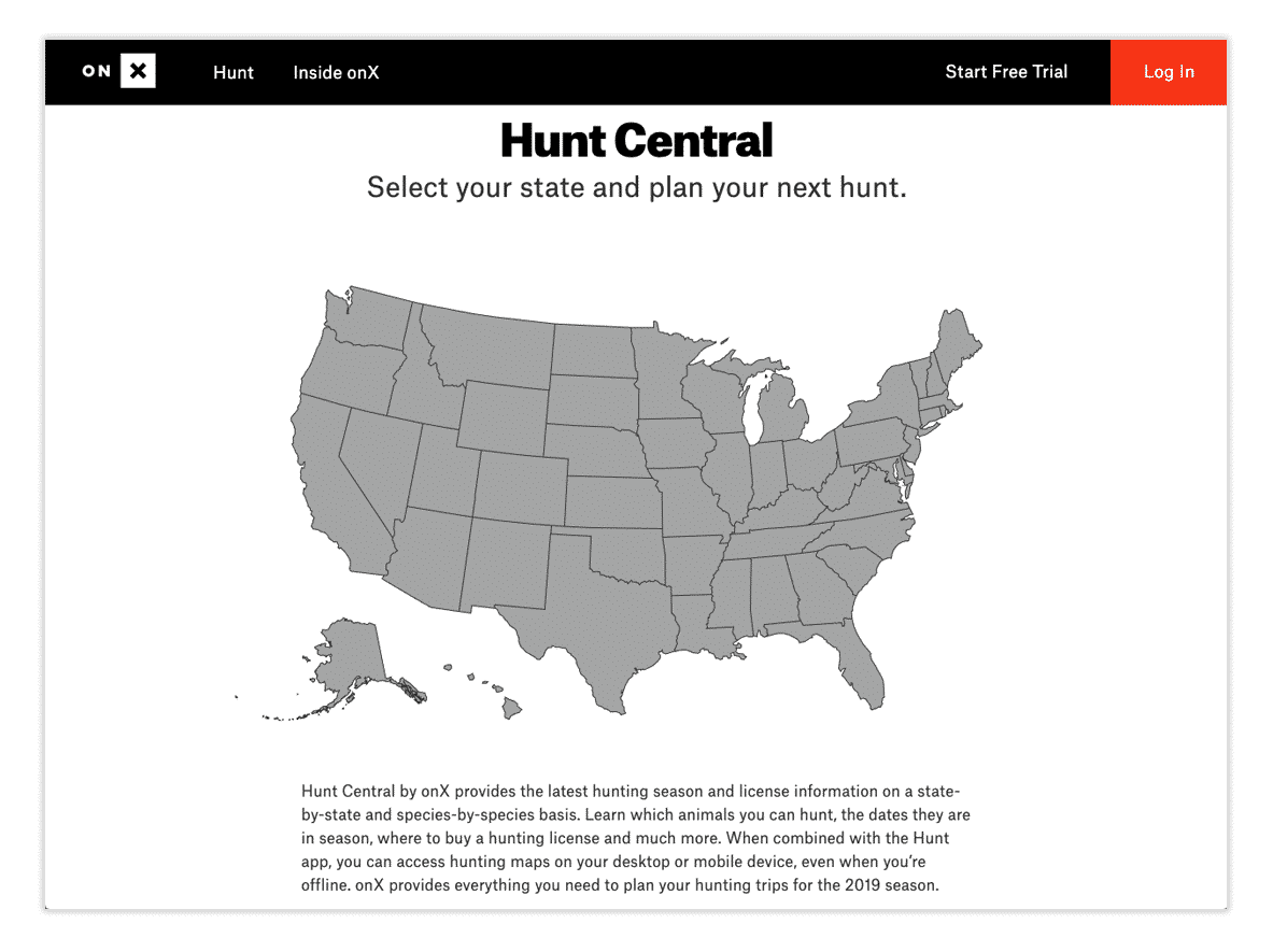 We’re often asked how to find public hunting land near me. To do this, try a free trial of onX Hunt. Elite members can view all 50 U.S. states and Canada. Premium members can view maps of up to two states, depending on membership level. These detailed maps will allow you to complete the next step easily. Explore a map below.