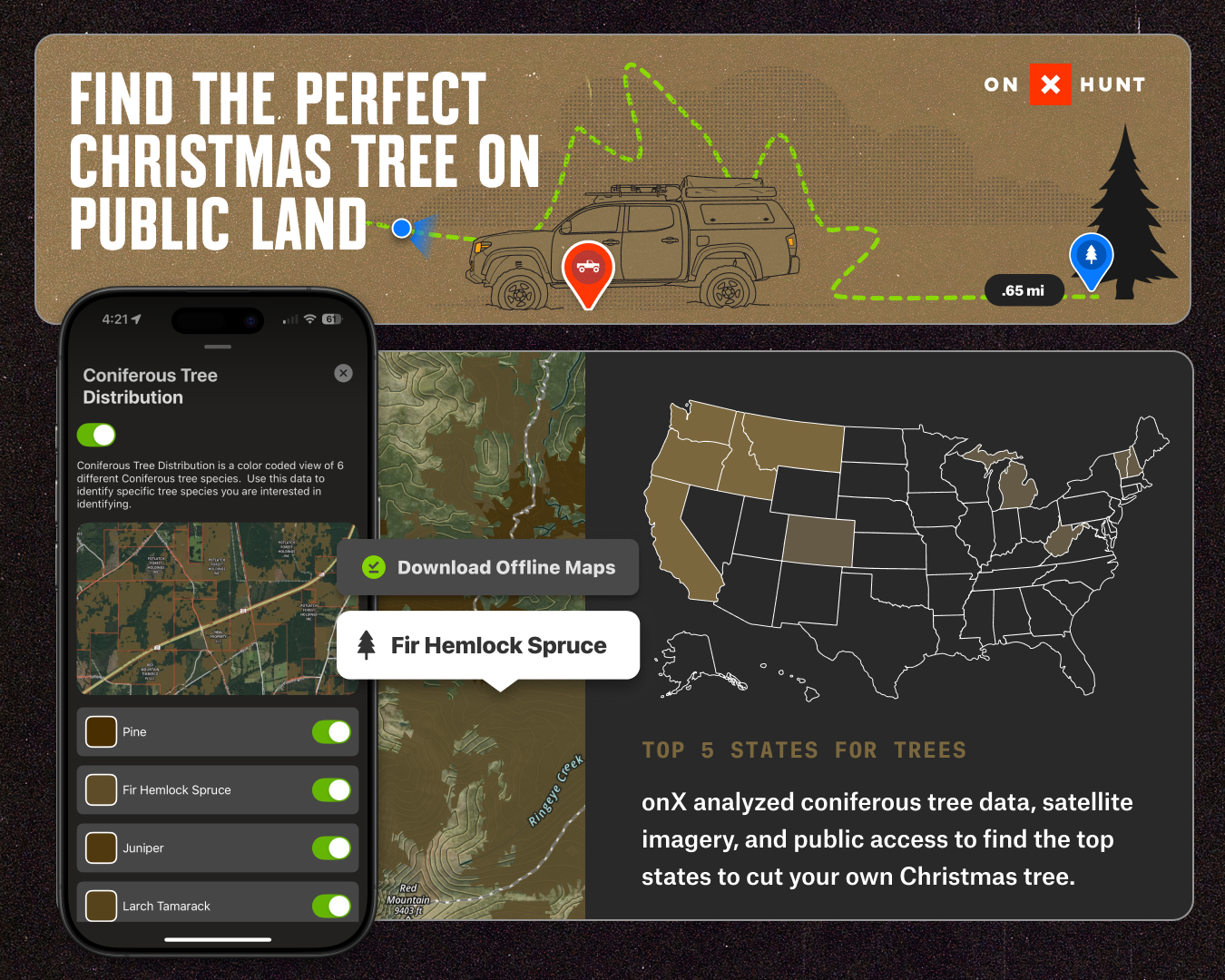 By analyzing public lands data, coniferous tree distribution, satellite imagery, and permit guidelines, onX makes it easy to create cherished holiday traditions.