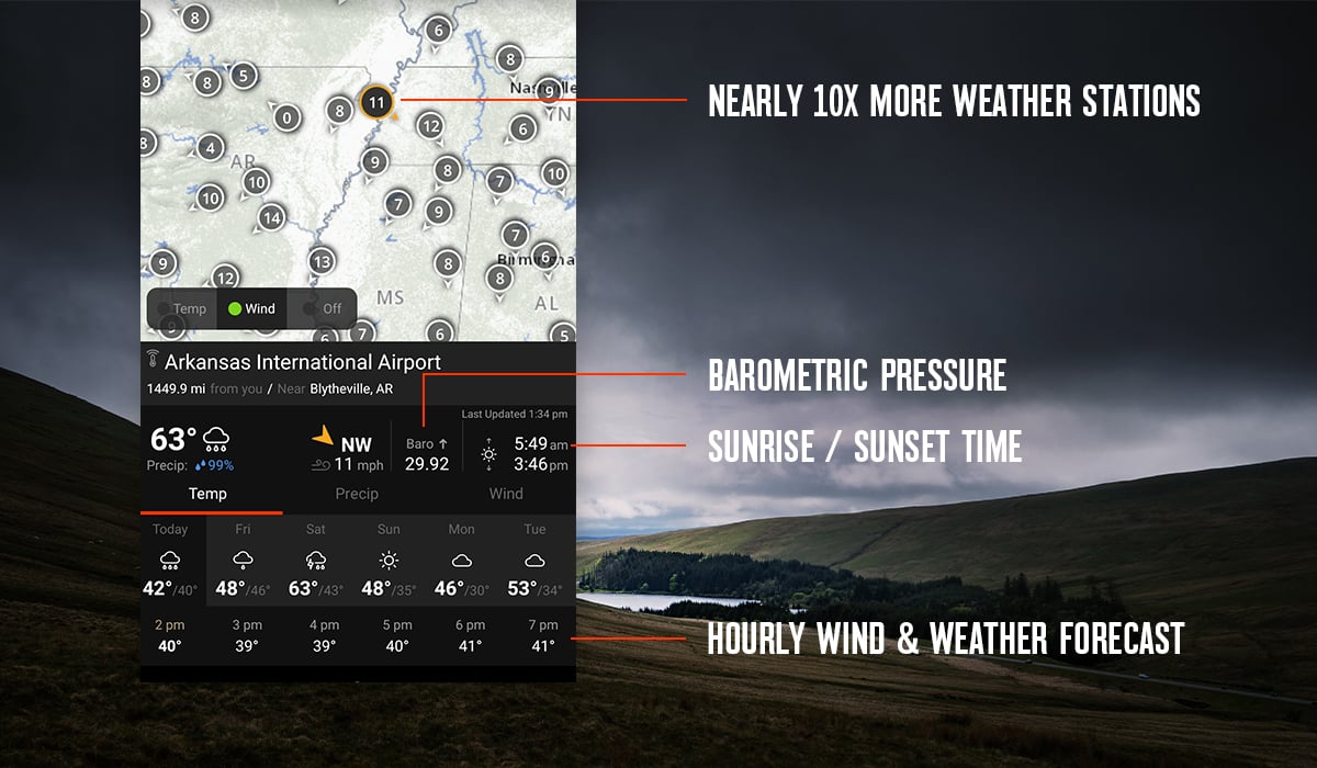 Prior versions of our Wind & Weather feature used reporting from airport weather stations around the country. Now, with the integration of Weather Underground’s vast network, we have incorporated nearly 10 times the number of weather stations. These new weather reports offer the most innovative forecast models available and cross-verify output with all of Weather Underground’s localized data points. It’s an unrivaled system of weather reporting that can provide the most accurate weather information possible—key for when you’re heading into the mountains or out to the tree stand for a long sit.