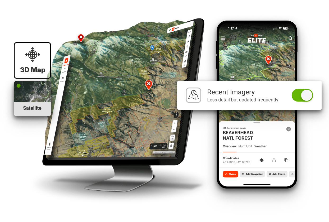 Up your odds of success in any pursuit with a deeper understanding of the land you’re moving through. Know where you can (and can’t) go with public and private land boundaries and access points. See the terrain in new ways with 3D views, Lidar hill shading to spot subtle elevation changes, and Recent Aerial Imagery updated every two weeks.