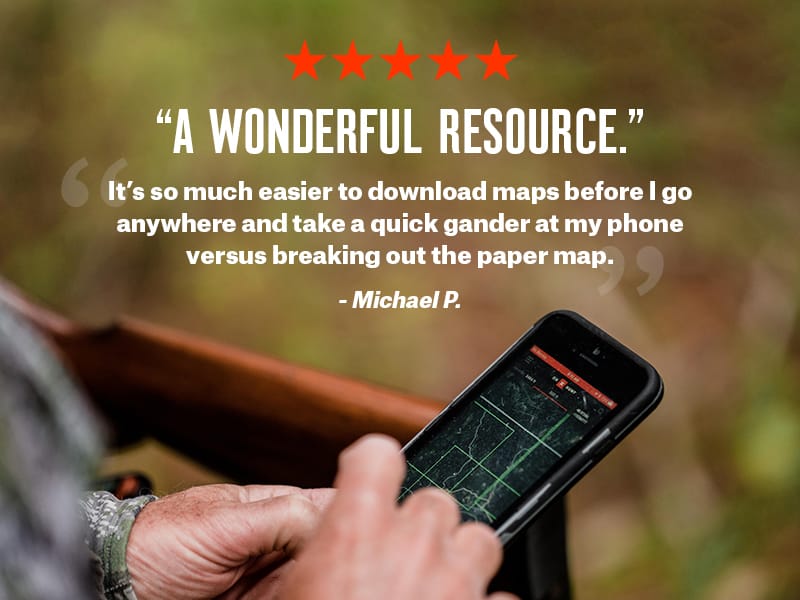 Featuring public and private landowner data, wind and weather forecasts, custom Waypoints and more starting at $34.99 / year.