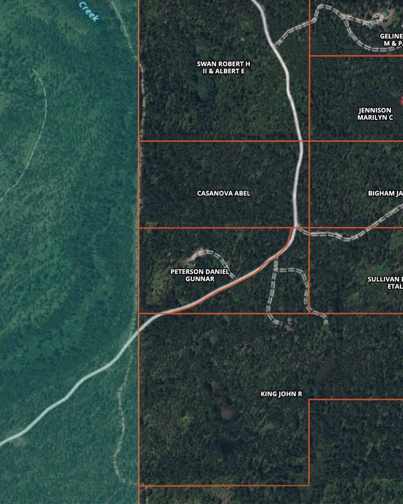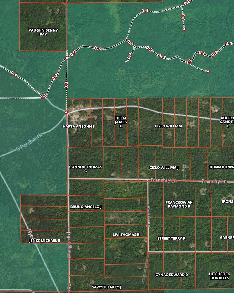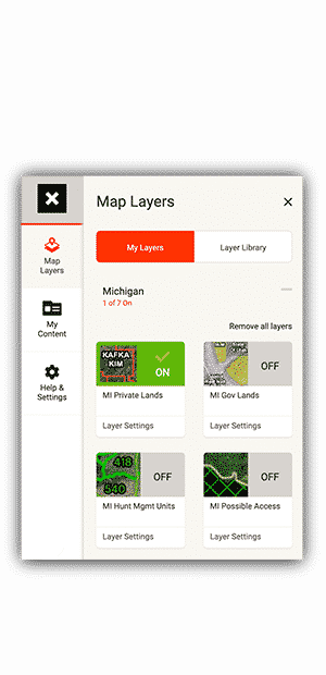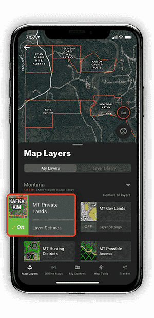 To find property lines on the onX Hunt App, turn on the “Private Lands” Map Layer (found under a given state’s Map Layer collection). You will see private property boundaries outlined in red, showing who owns each parcel and where a property begins and ends.