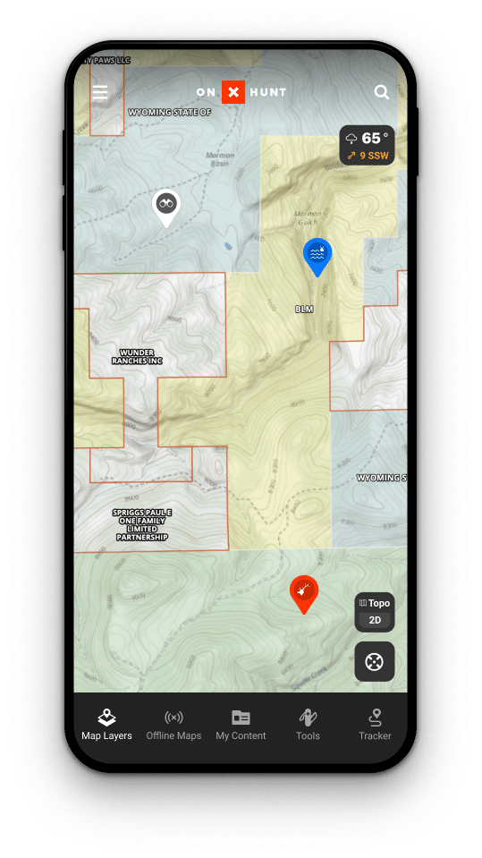 Every hunter understands that knowing the lay of the land—and being able to use it to our advantage—is part of the battle. Use Map Markups in the onX Hunt App to add, view, and manage details specific to a certain parcel of land. Add Waypoints, Tracks, Lines, and more to help remember certain land features, access points, stand locations and more, helping ensure a smooth plan of operation on the day of your hunt.