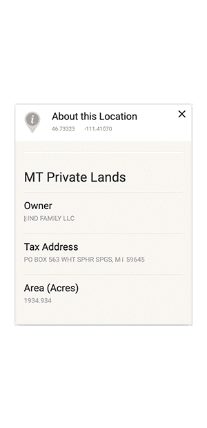 See landowner name, tax address, property coordinates, acreage, and more, right in the Hunt App. This information makes it easy to understand if land is publicly or privately owned and—if private—who you should contact for permission to hunt. If an animal you shoot on public land crosses on to private, simply look up the landowner’s information so you know who to ask for recovery permissions.