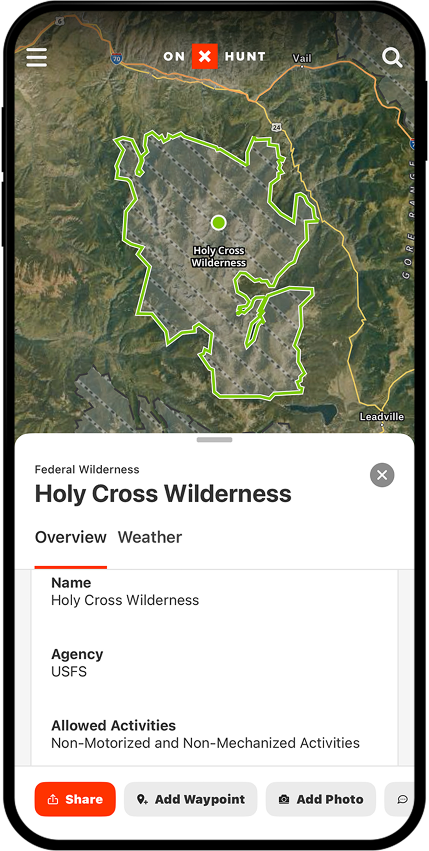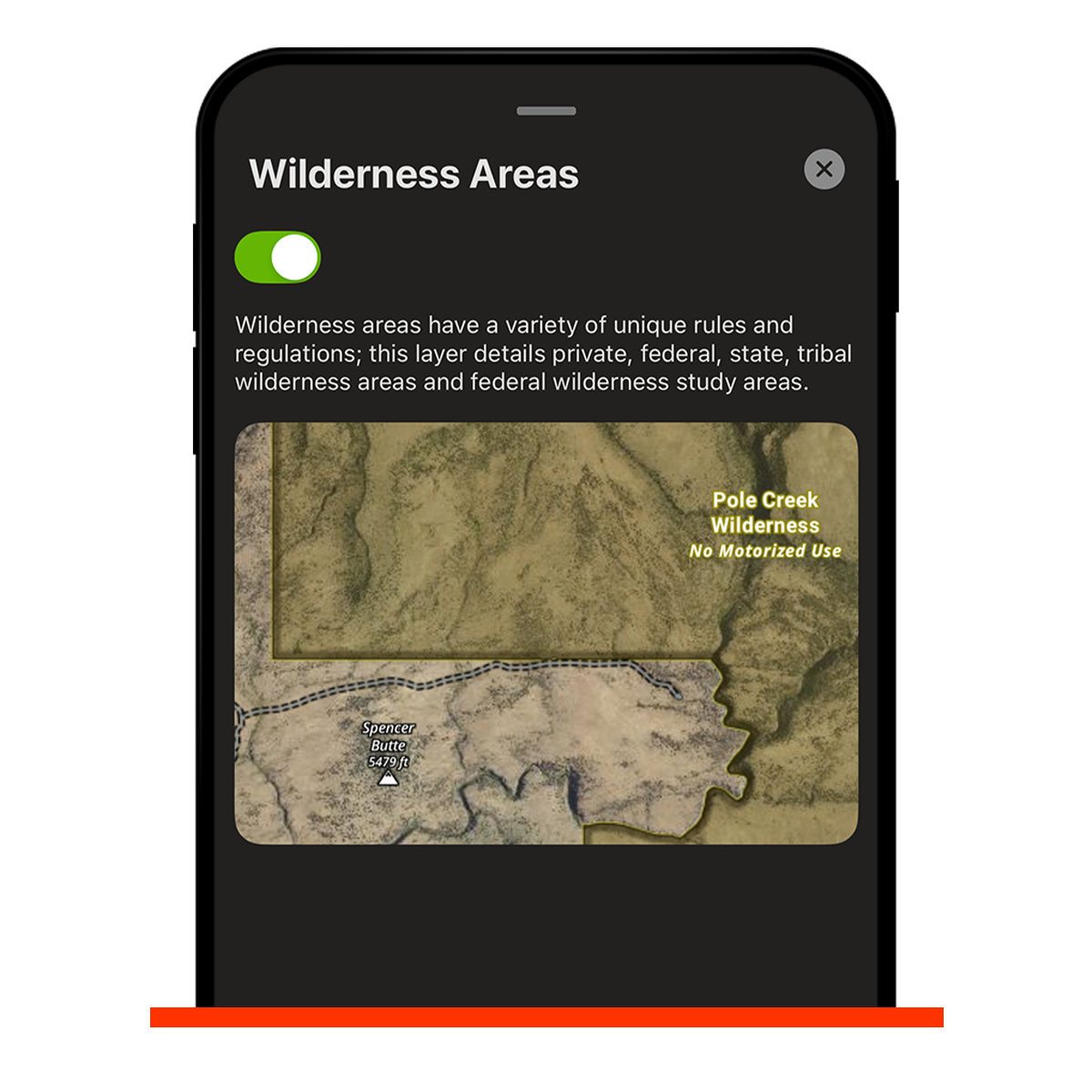 If you’re near wilderness areas or hunting in and out of a wilderness area boundary, the onX Hunt App helps you clearly understand where you cannot go with a car, side-by-side, e-bike, or bike. These clear boundaries differentiate wilderness areas from private land with clearly marked boundaries.