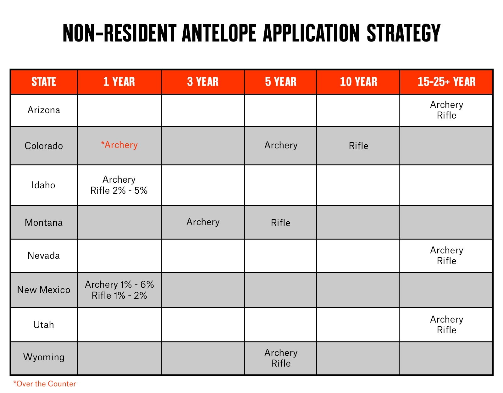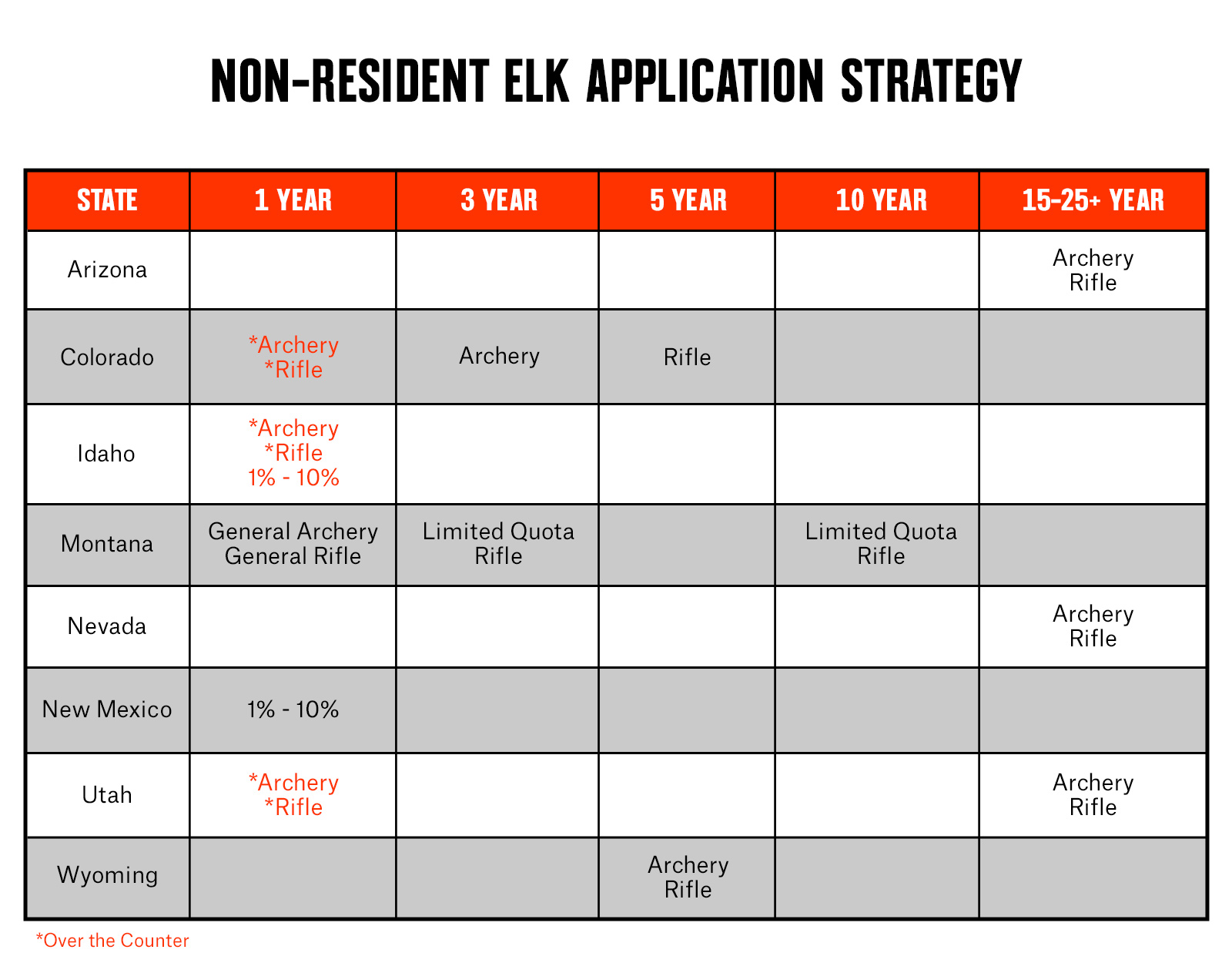 With a better understanding of which states offer which types of opportunity, we‘ll break down a more detailed look at planning a short (one to three years), intermediate (five to 10 years), and long-term (15+ years) plan for each species. With the exception of Idaho and New Mexico, the hunts assigned to each column represent a 50% or higher probability of being drawn. The better over-the-counter hunts in these states are also represented in the one-year columns.