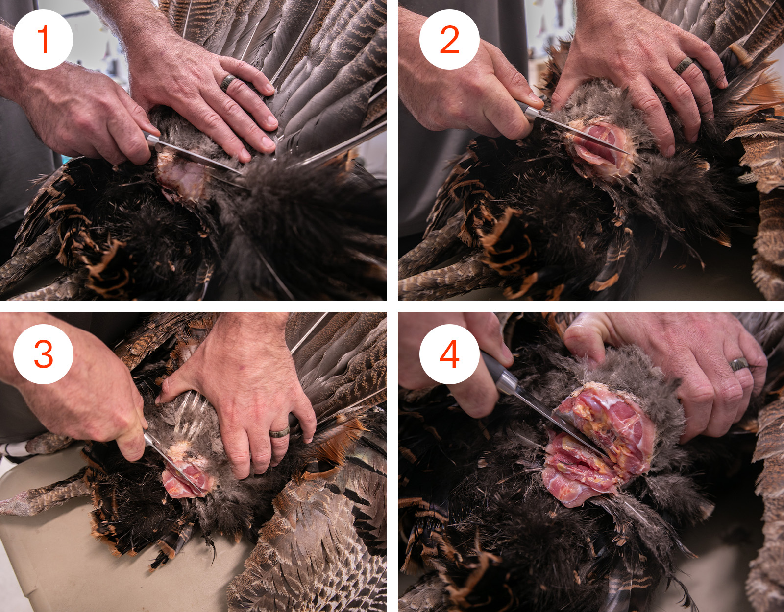 In essence, with the bird laying breast side down, you’ll want to use a sharp knife to cut into the meat between the bird’s vent and the base of the tail feathers where you’ll find a small knob. Take care not to cut into any part of the feathers, including the tissue that is holding the feathers together at their base.