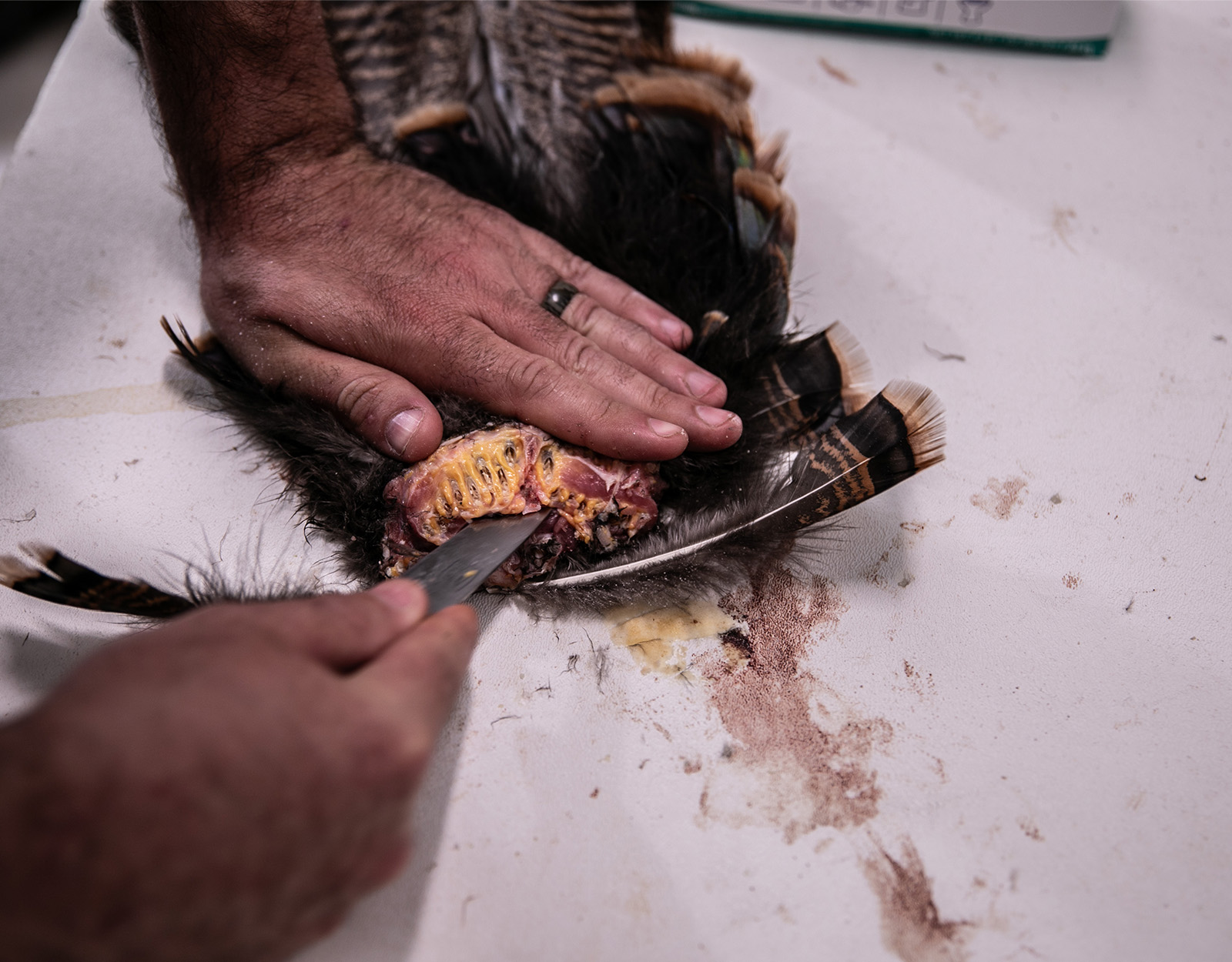 Once the tail fan has been removed, scrape away as much fat and meat as possible to make the drying process more efficient, again taking care not to cut through any connective tissue. You’ll see that some downy feathers might still be on the tail. You can remove those if you wish, but keep all the flat, color-tipped feathers you see. A turkey tail is typically made up of three different lengths of feathers.