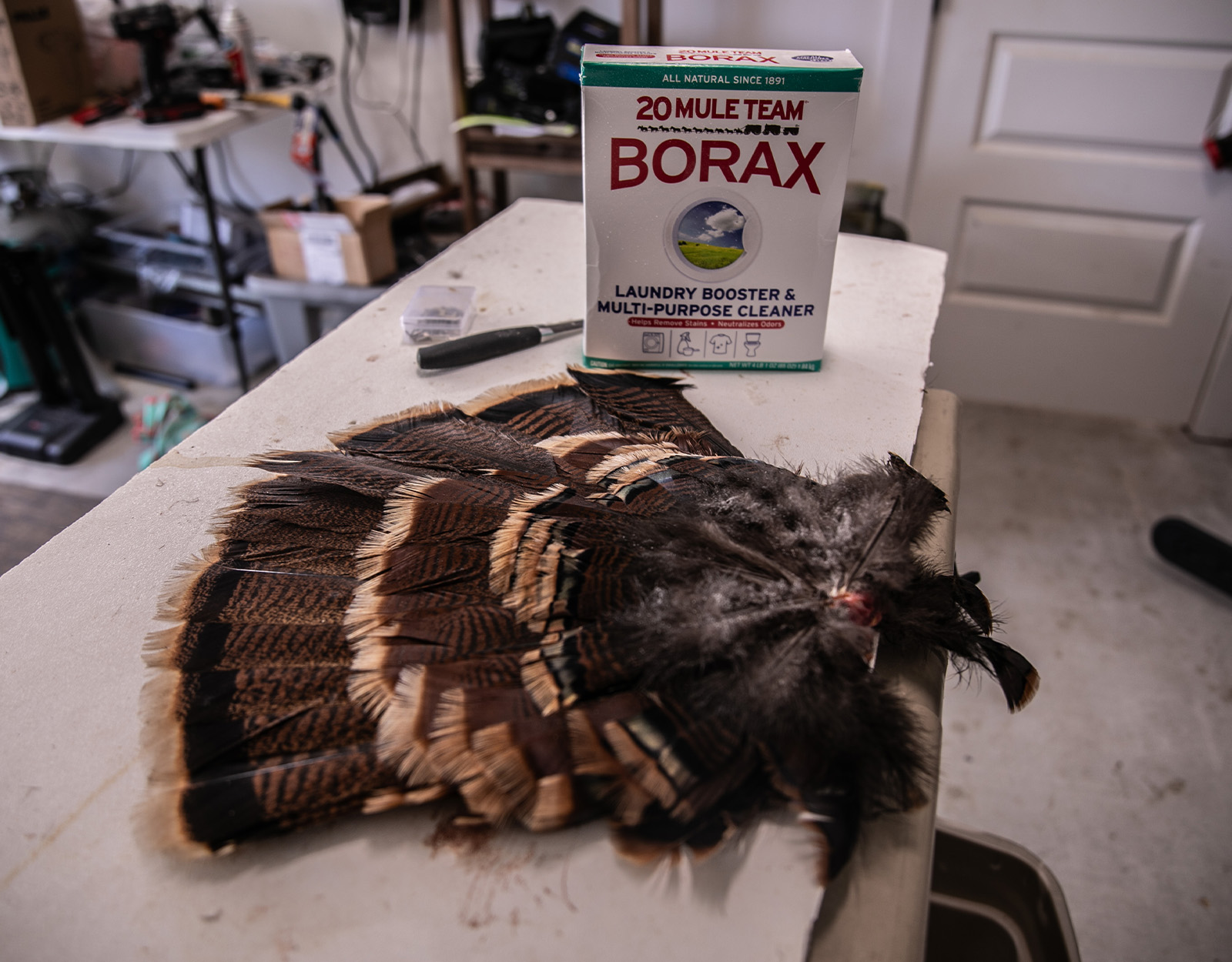As an optional step for preparation, some hunters like to soak the fleshy part of the fan in a coffee can containing Coleman white gas for about an hour to help degrease the tail. After soaking for an hour, remove the fan and wash the part that was soaked with Dawn dish soap, and then use a hair dryer on Low/Medium heat to dry the feathers. This will help the feathers fluff after being washed.