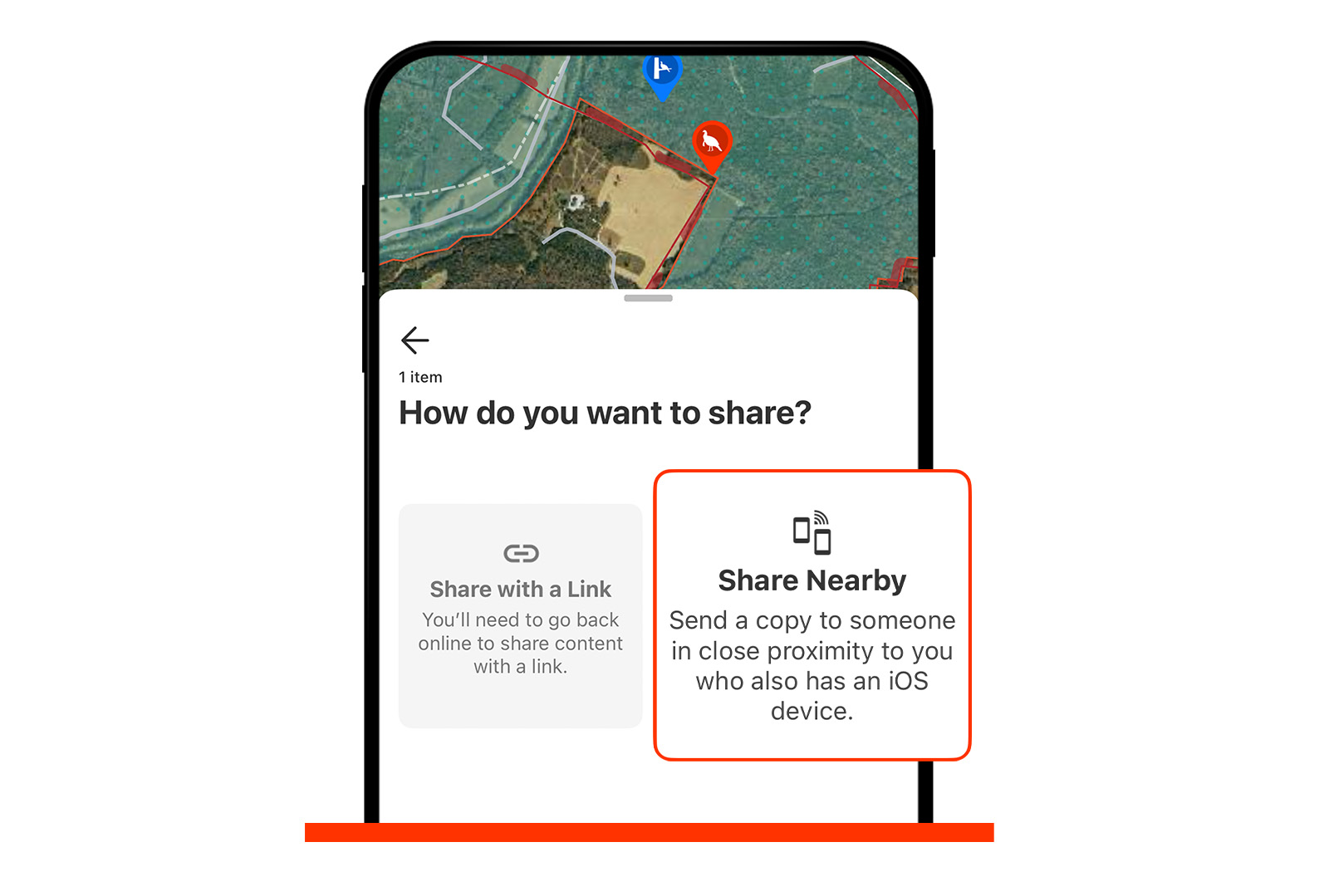 - No Service? If you’re offline, choose “Share Nearby.” A card with directions will appear; tap “Next” (your device may then prompt you to allow onX to find other devices). Share Nearby uses Bluetooth to find devices near you. If your recipient is near you and has the same type of device as you (e.g. you both have Androids, or you both have iPhones), you’ll see them appear in the “Share Nearby” card.