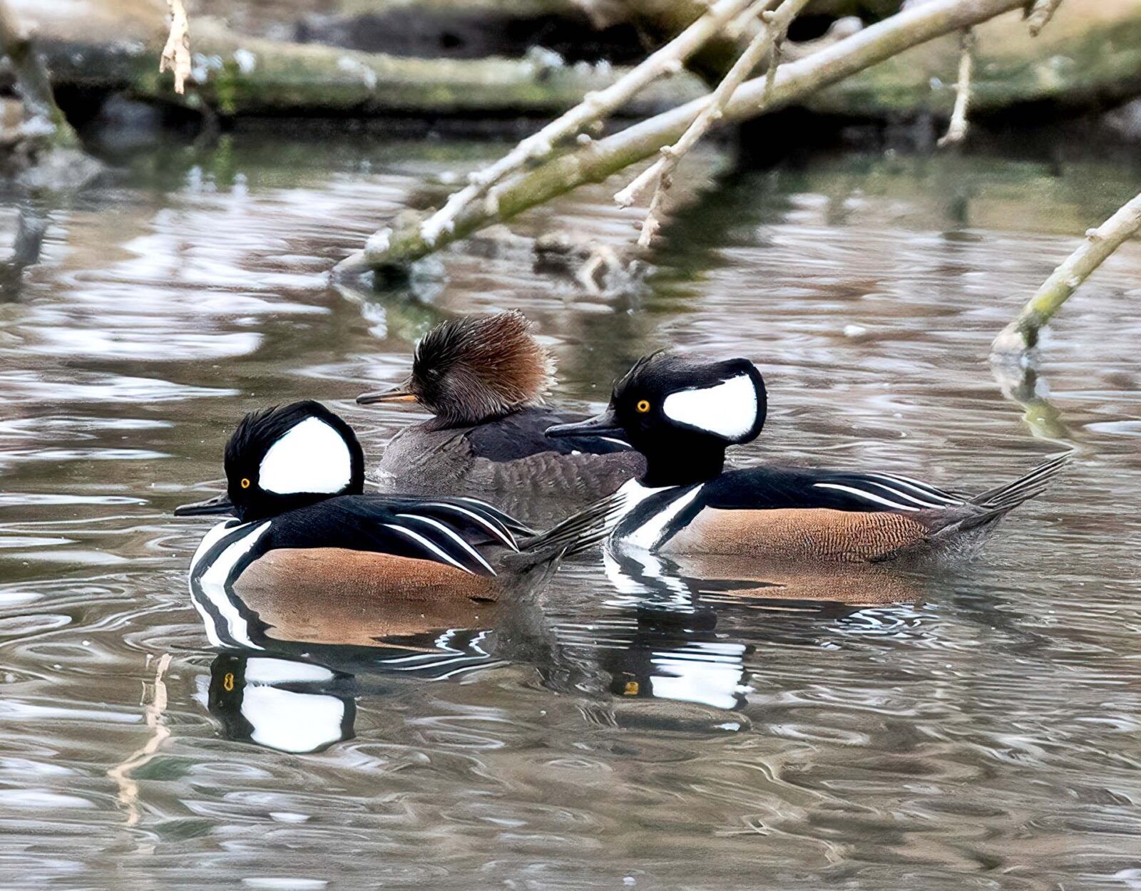 Mergansers are specialists that seek clear water habitats with abundant fish or aquatic invertebrates. Hooded mergansers are cavity nesters, much like wood ducks, and favor wooded wetlands, beaver ponds, oxbows, and slow-moving forested creeks. They are often early arrivals in the fall and early to depart in spring.