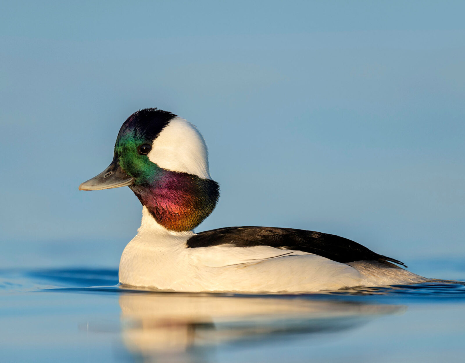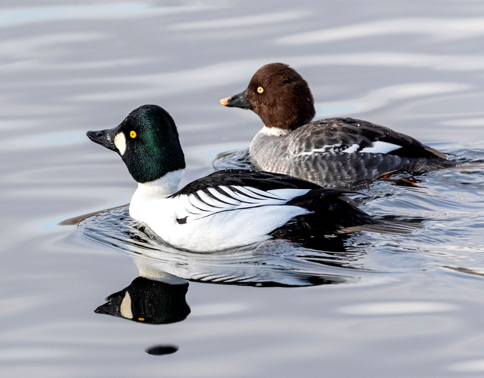 Bufflehead are the smallest diving duck in North America, often flying in pairs or small flocks. Drakes feature a bold white head patch and iridescent plumage, making them highly visible both on the wing and on the water. Goldeneyes—primarily the common goldeneye, with the less frequently seen Barrow’s goldeneye—are larger than bufflehead but still compact and quick. Males are known for their crisp black-and-white contrast, greenish or purplish heads, and piercing yellow eyes that give the species its name.