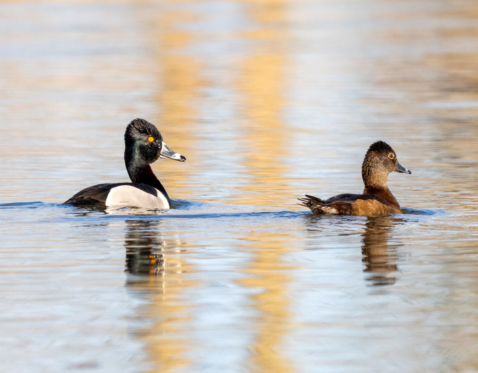Ringnecks are medium-sized diving ducks, but much of their behavior resembles dabblers. They are widely distributed across North America and particularly abundant throughout the southeastern U.S. during winter. Agile and fast-flying, they are a favorite among hunters who know where to find them.