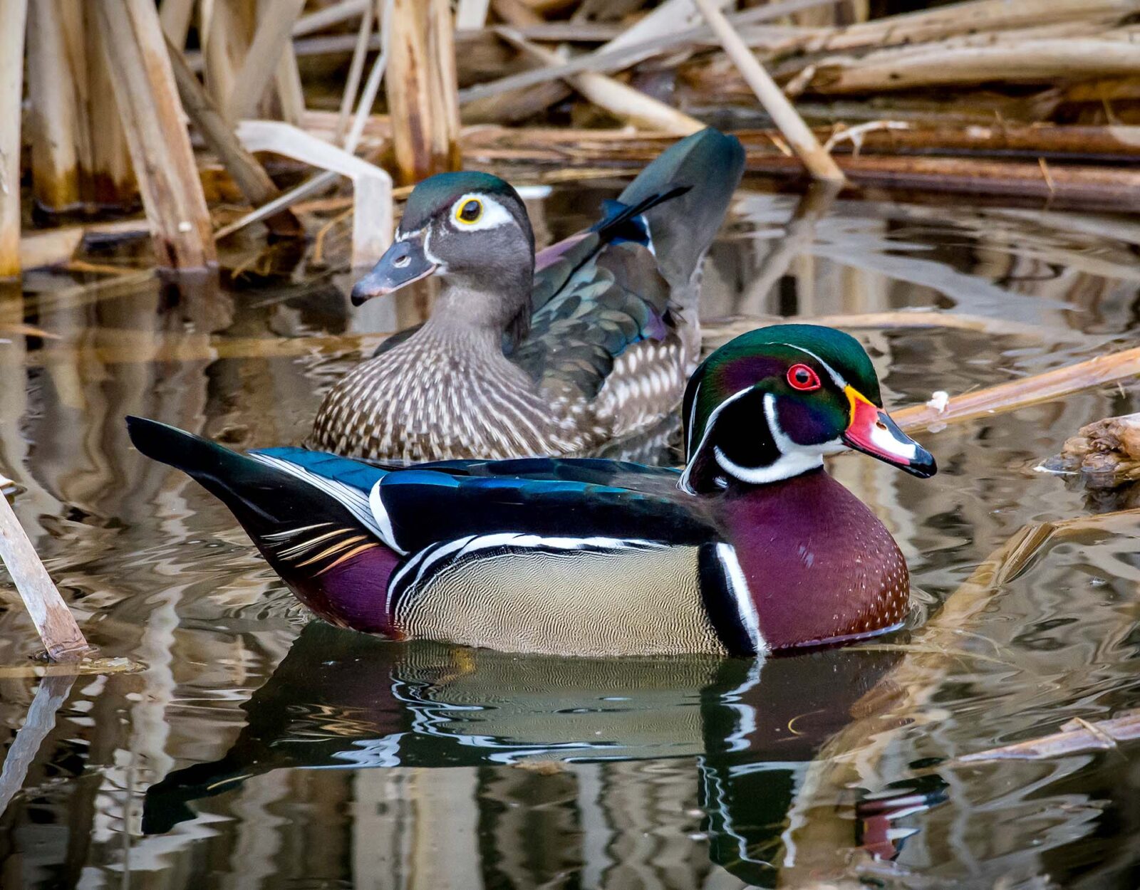 Often considered one of the most striking of all North American ducks, wood ducks are easily recognized by their iridescent plumage and distinctive crested heads.