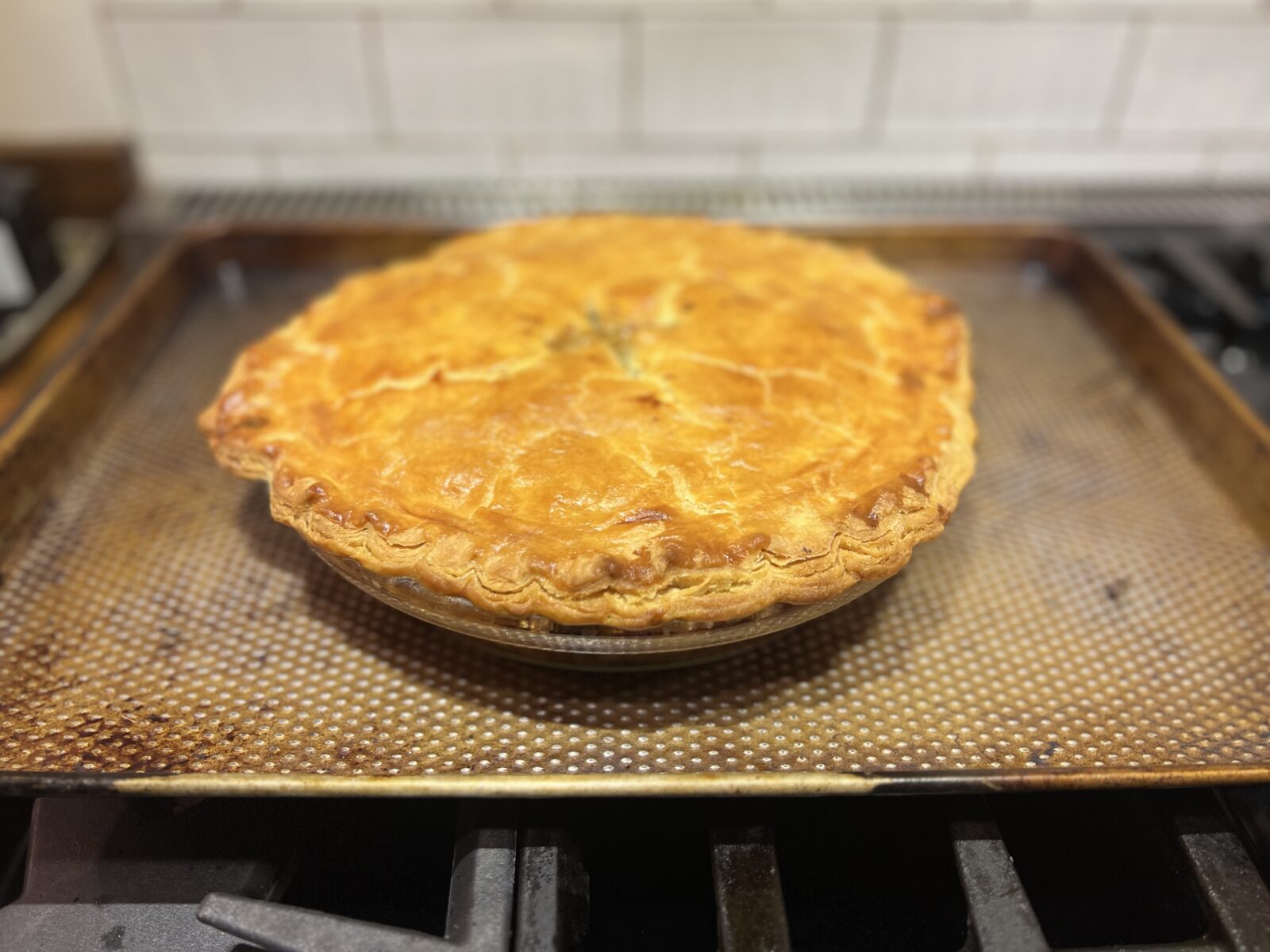 - Spoon the turkey mixture into a 9-inch (23 cm) pie plate. Top with the pastry round and trim the edge to about 1⁄4 inch over the rim. Crimp the pie dough with your fingers. Brush the top of the pastry with egg wash. Snip an X in the middle with scissors or cut with a knife to allow steam to escape. Place the pie in the oven and turn down to 350°F. Bake until the pastry is a deep golden brown, 1 to 1-1⁄2 hours. Cool slightly on a wire rack before cutting with a serrated knife and serving.