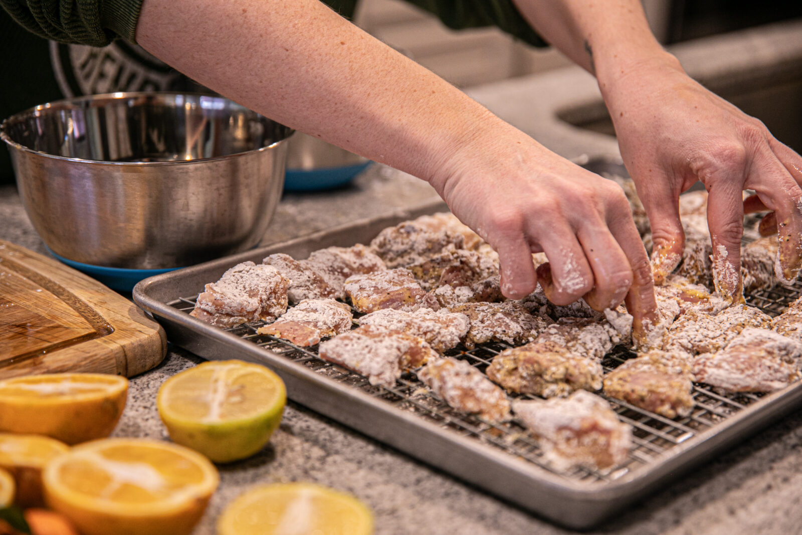 - Remove the diced turkey breast from the brine and dredge in the whisked eggs and then toss into the bowl with the dry ingredients. Shake off any excess dry ingredients and set aside on a baking sheet, preferably one with a wire rack.