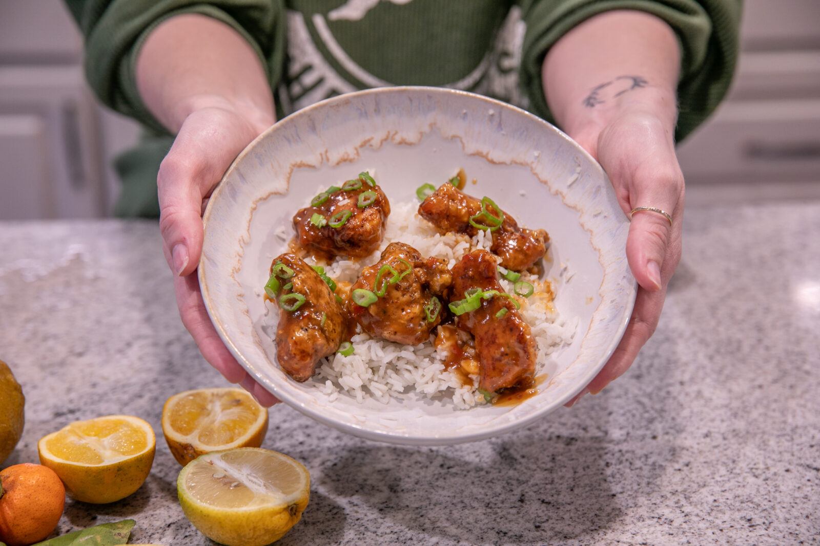 - Before the turkey cools, add them directly into the saucepan with the Orange Sauce and toss to coat on all sides.