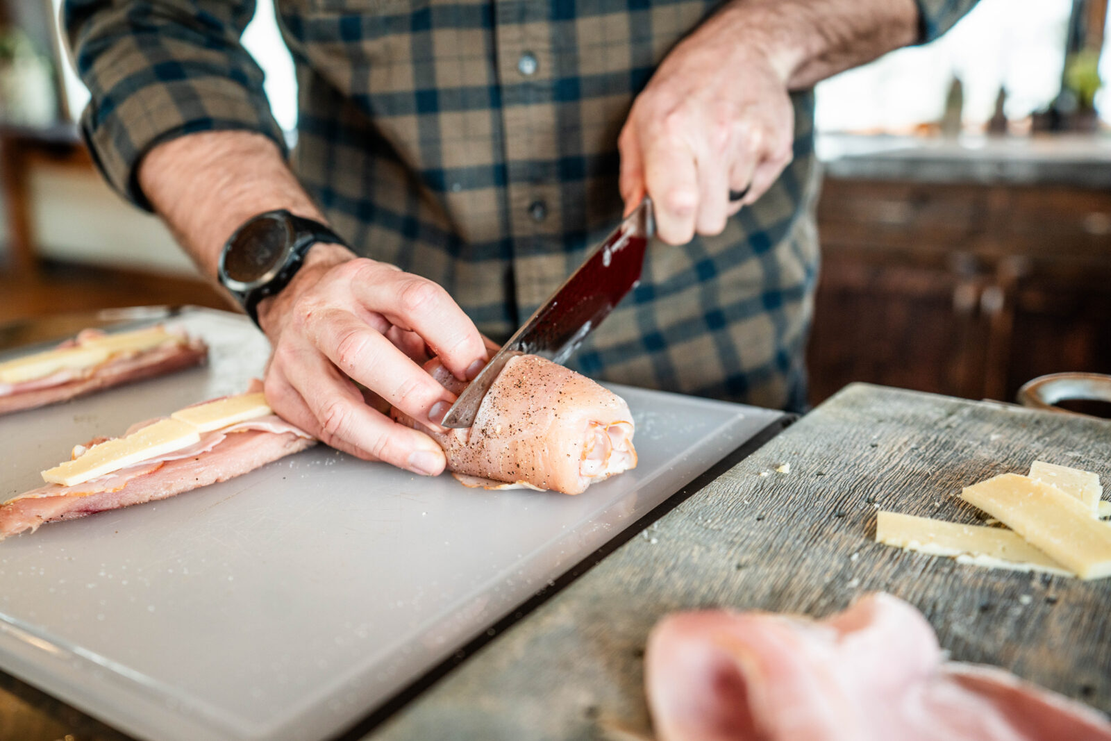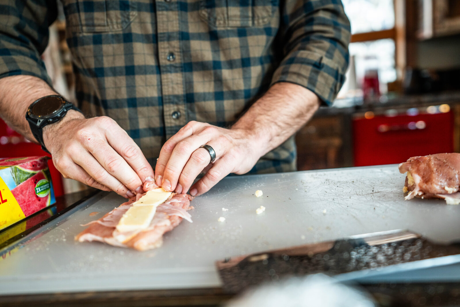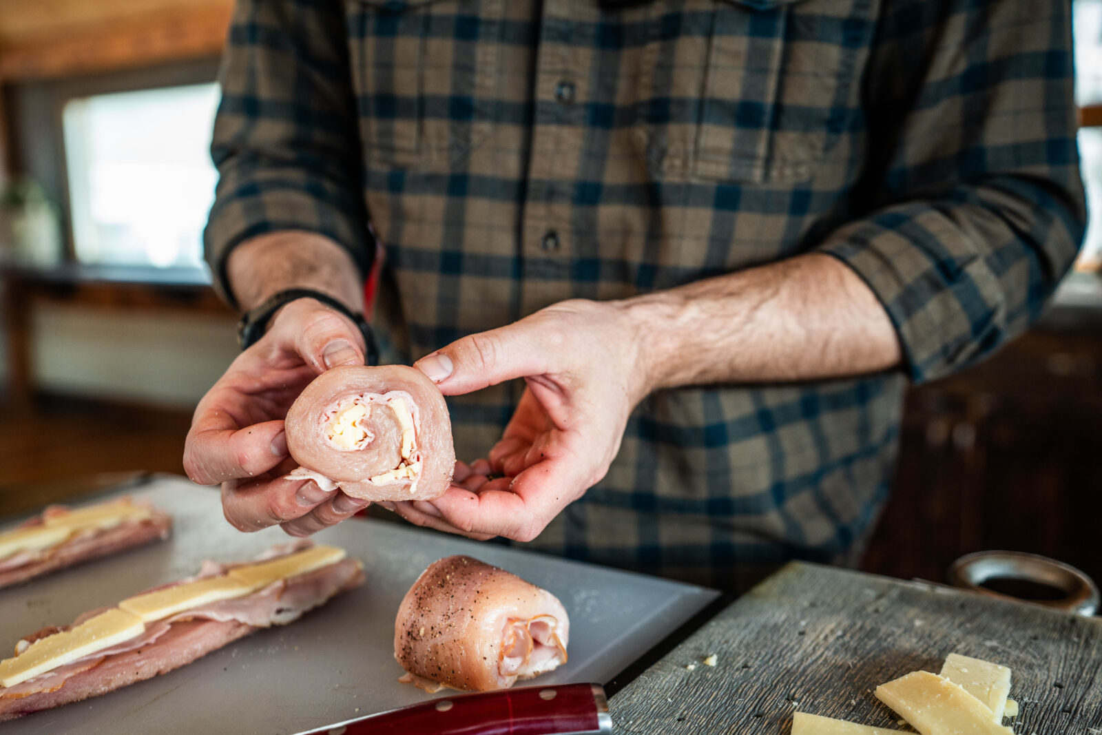 - Cut the breast into strips 2-3 inches wide. Place ham and cheese on the meat and roll tightly.