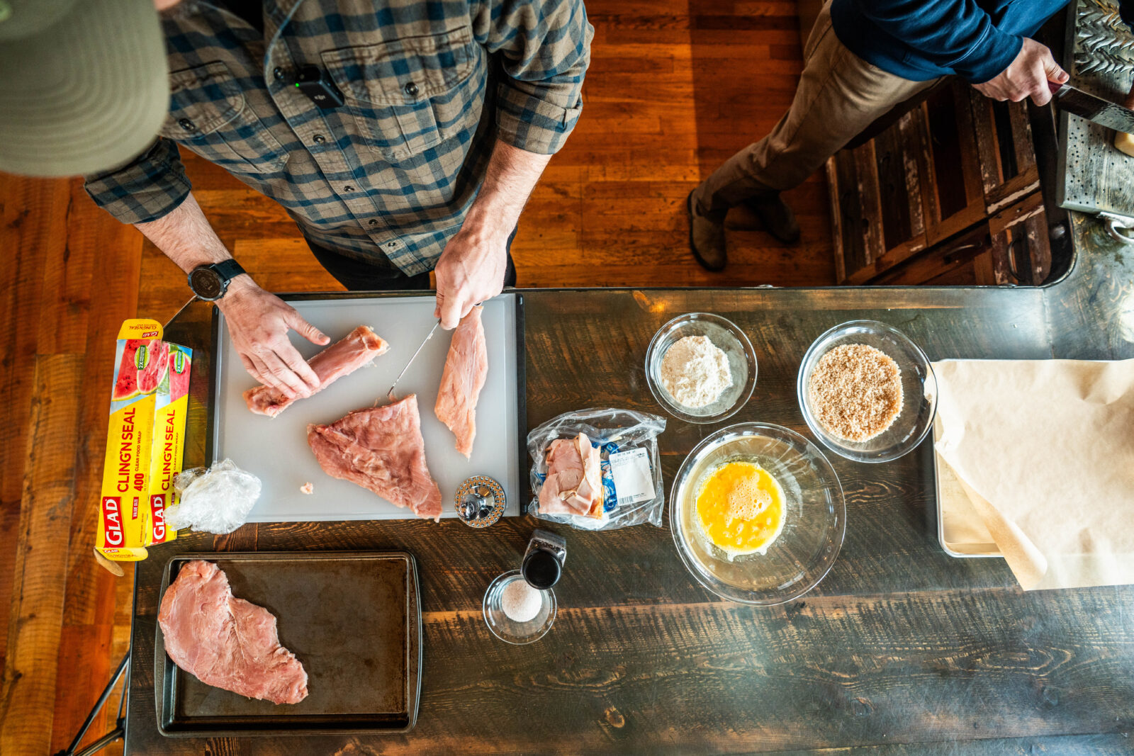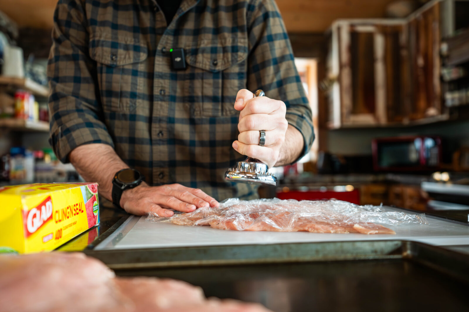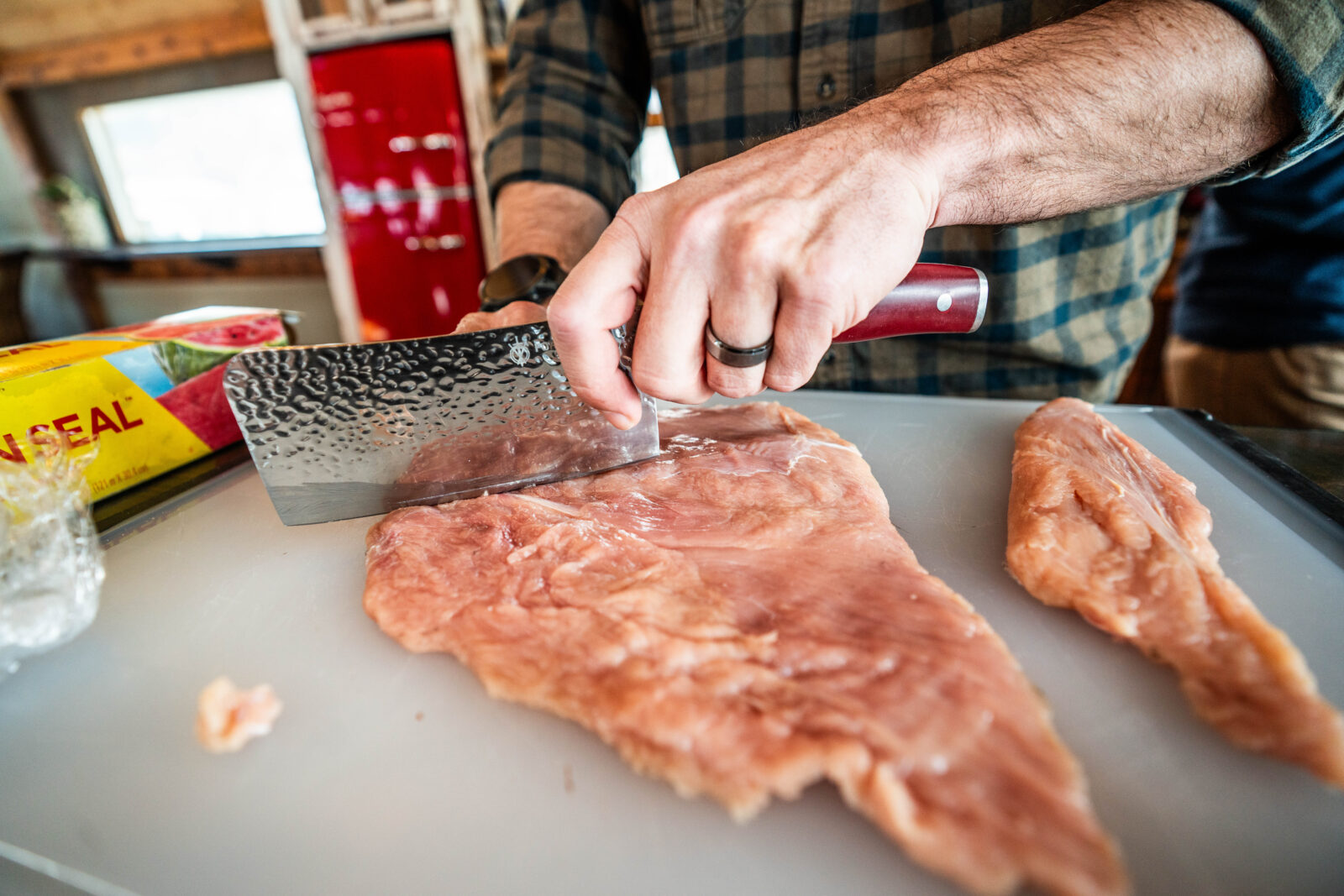- Start with a full lobe (one turkey breast) covered in plastic wrap on a cutting board. Pound the hell out of it with a mallet and work it until you get thin, even pieces about the depth of your hand if you lay it flat on the table. Add salt and pepper.