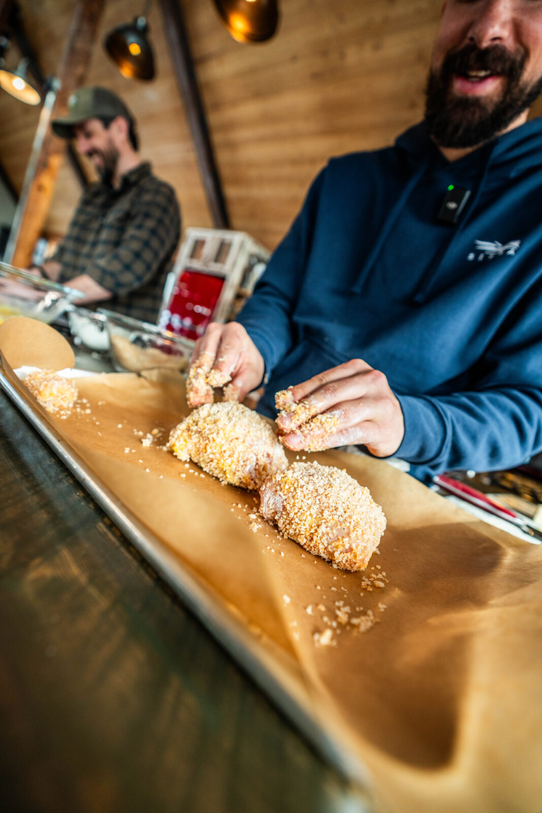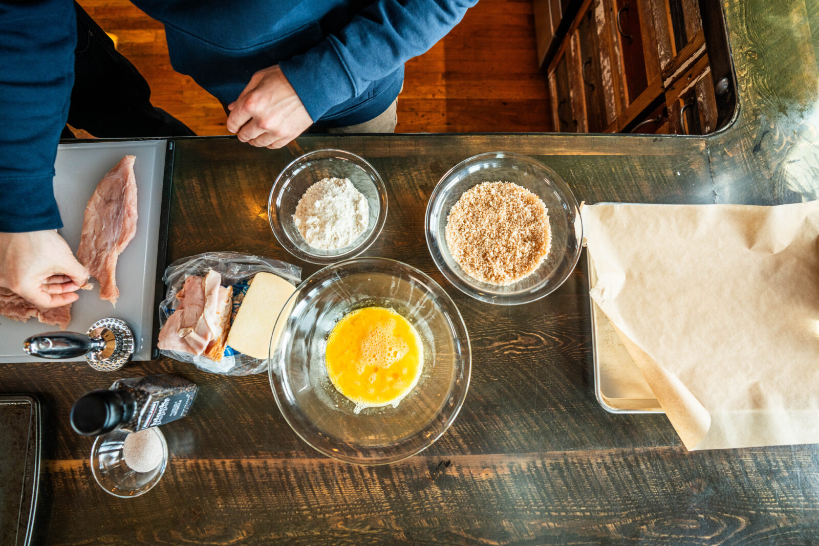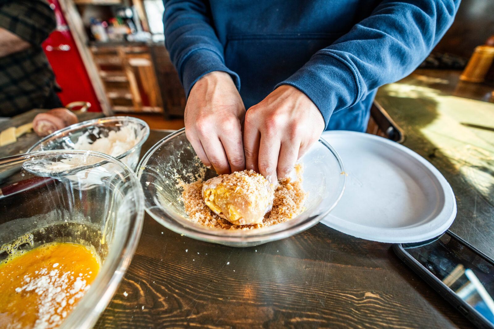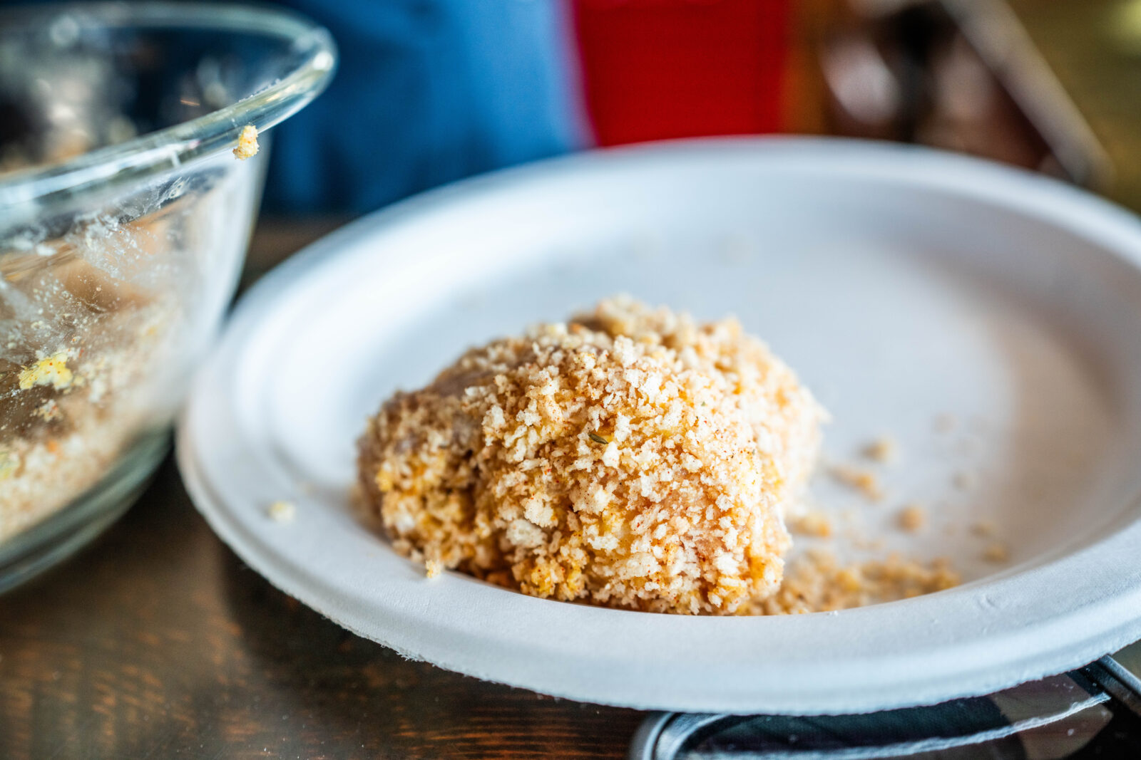 - Dredge in egg wash, then flour, and roll in panko breadcrumbs. Place on a sheet pan covered in parchment paper.