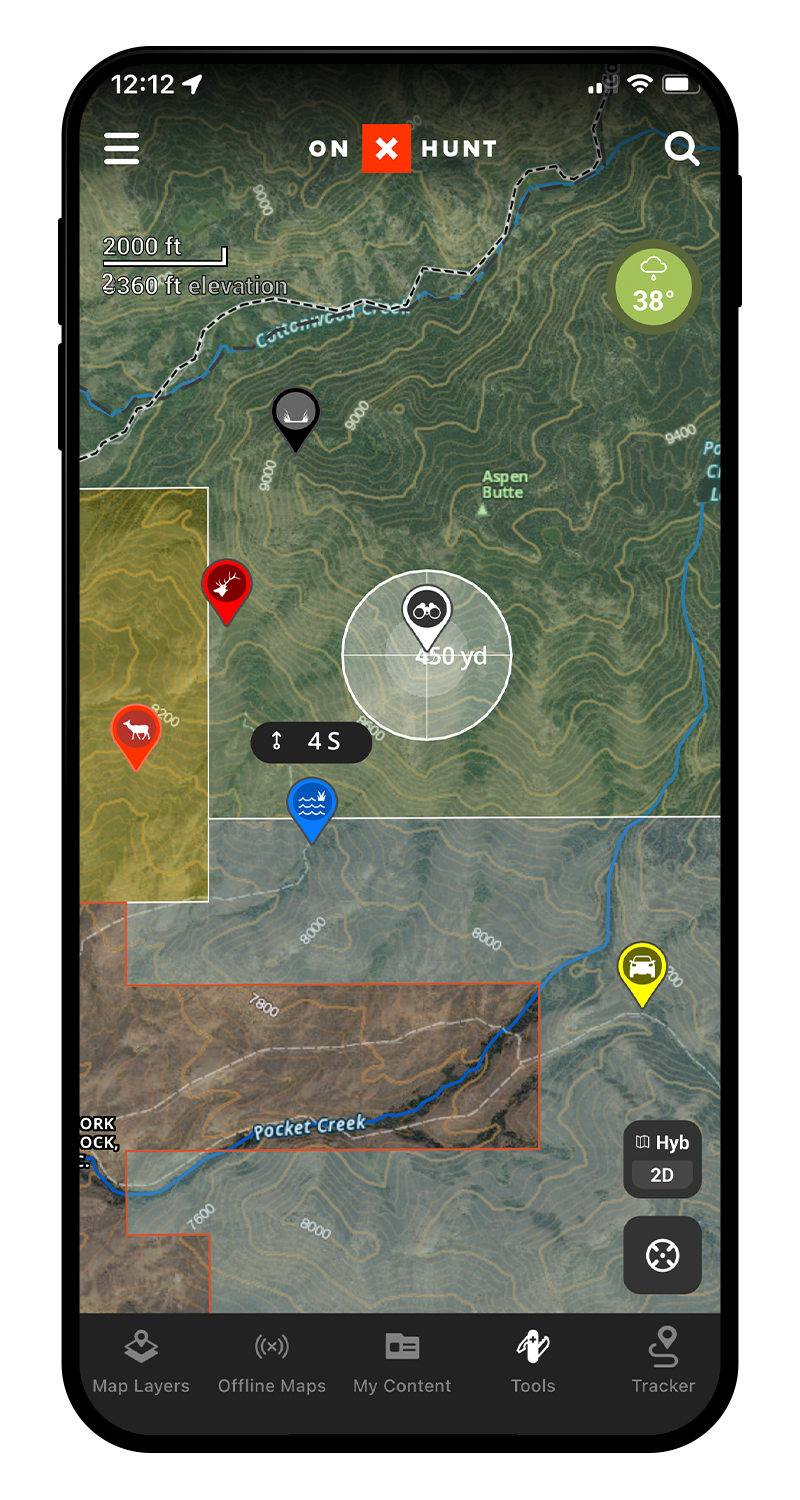 Customizable Waypoints, Lines, and Tracks will help you map out every detail of your hunt. Whether you’re hiking to your favorite glassing point in the dark, exploring all new ground, or chasing a bugle in the dark timber the onX Hunt App has tools for every aspect of your hunt. Learn More.