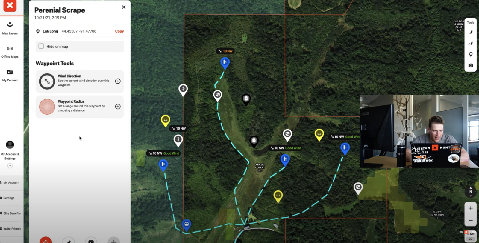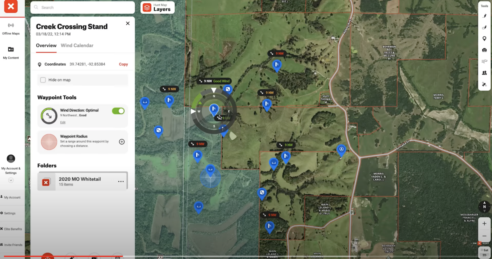 Marking tree stand locations, trail cameras, and crucial deer sign like scrapes or trail intersections will help you gain a better understanding of the property you hunt. Additionally, you’ll gain insight on the adjustments you need to make and identify overlooked areas. Waypoints are the foundational piece to many of our core whitetail features, such as Optimal Wind, Wind Calendar, and Markup Folder Sharing.