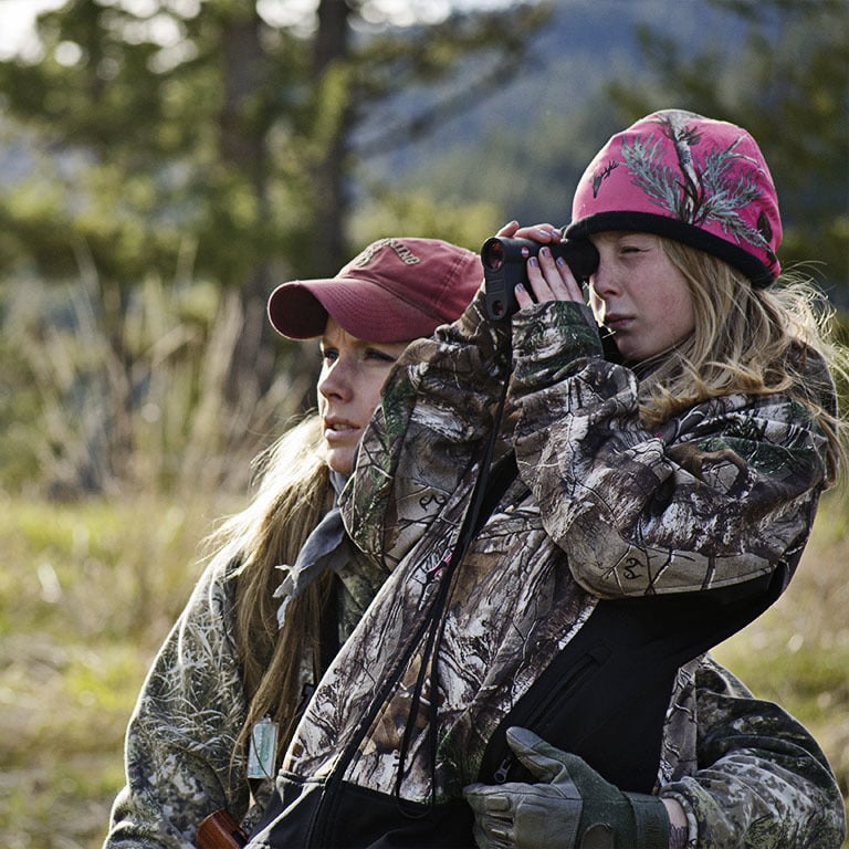 In a Cabela’s sweatshirt of her own, Lindsay shoulders her pack and straps on a .44 magnum in her hip holster, before helping Briger pull her binoculars on. The binoculars are handed down through the family, once belonging to Lindsay’s father, then to her and now to Briger. Another legacy from a tight-knit hunting family.