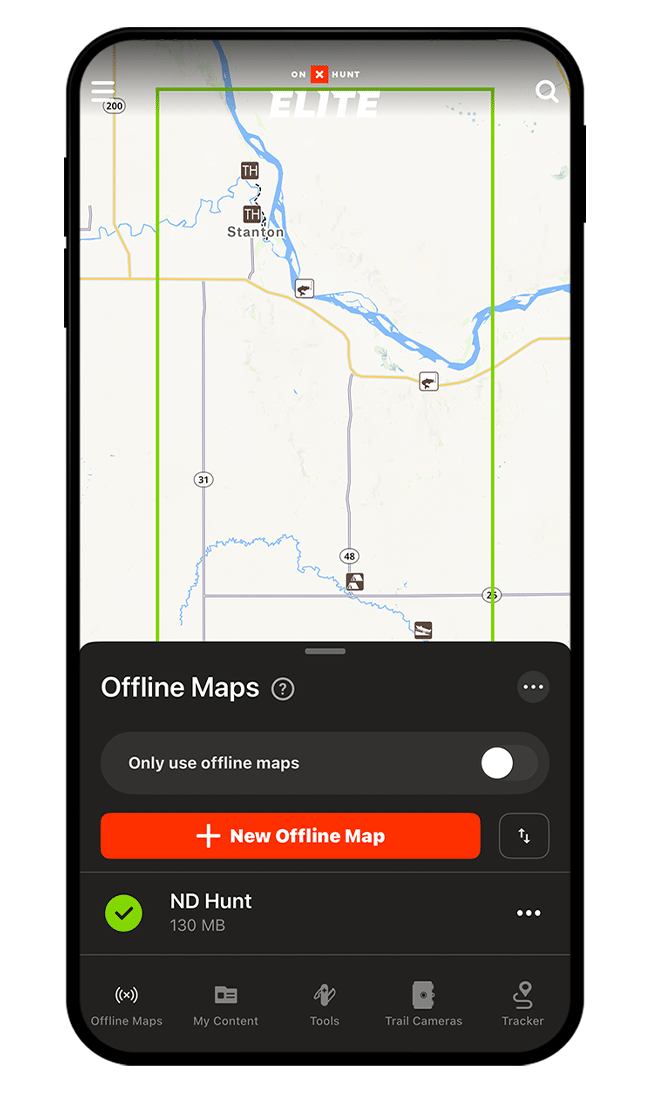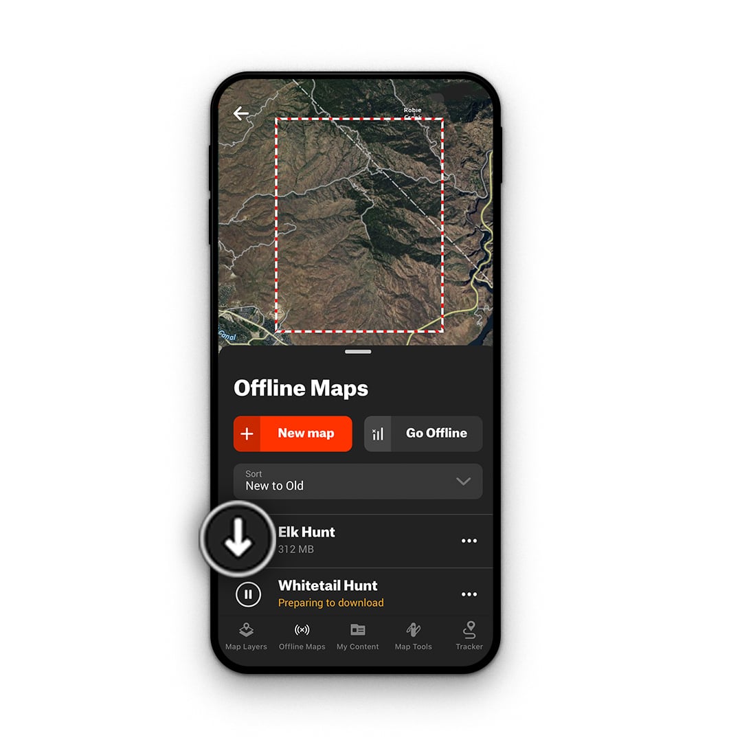 Open the Hunt App on your phone, tap the Offline Maps button, and tap the download arrow next to your queued Offline Map to download it to your phone.