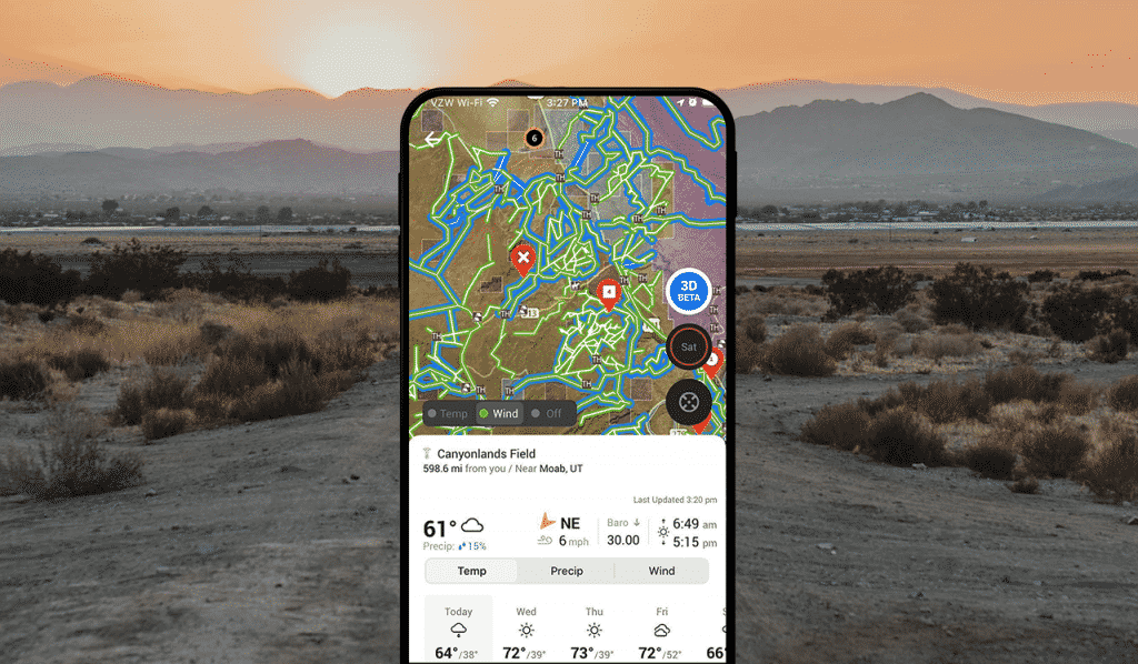 onX Offroad Bonus: Up-to-date weather is built right into the App for you, right on the main map screen. Tap the green circle in the lower right to see a 7-day forecast for temps, wind, precipitation, and sunrise and sunset.
