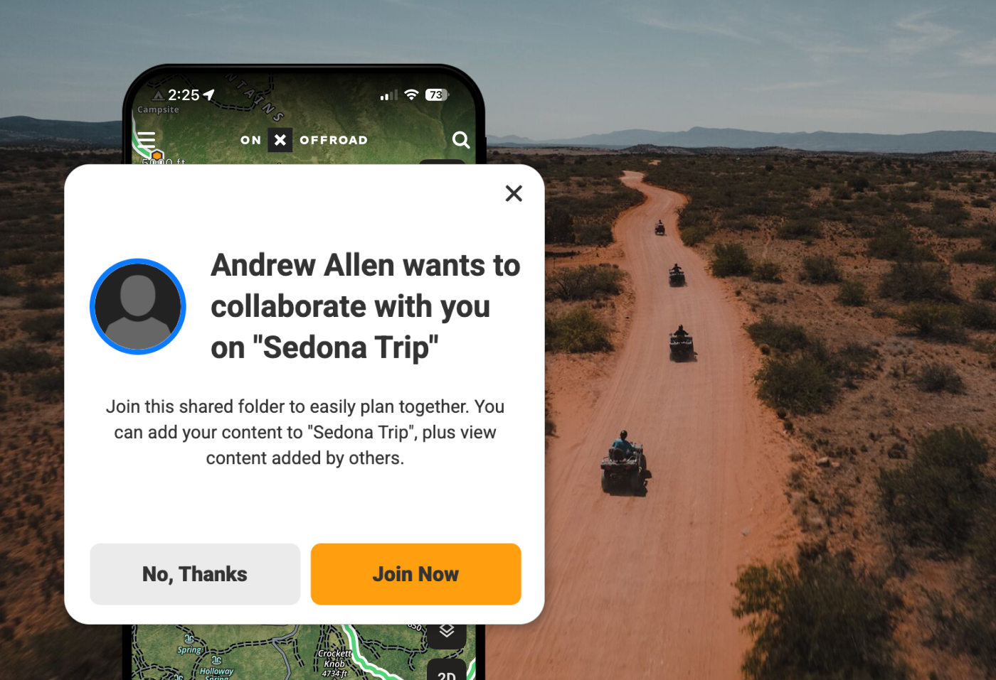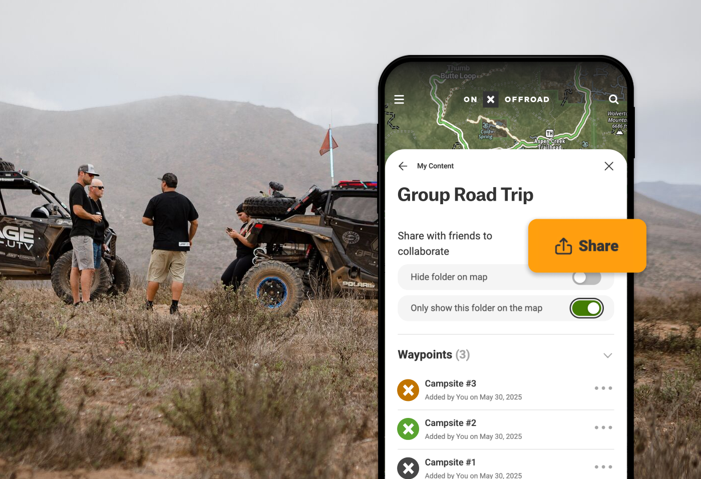 That’s why onX Offroad created Collaborative Folders. It’s a better way to bring your crew together and keep everyone aligned from the first waypoint to the last campfire.