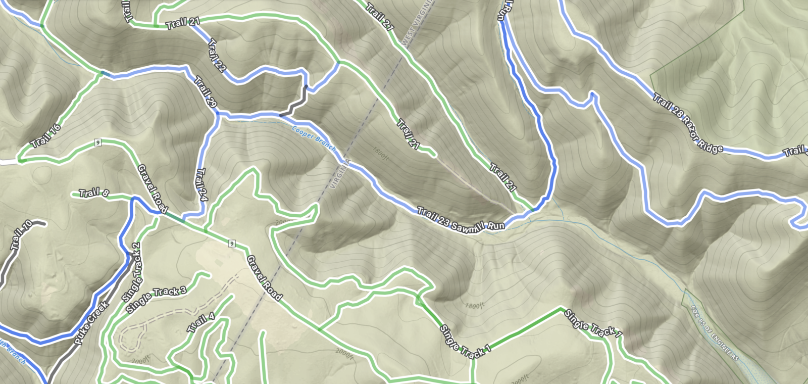 Just 30 miles west of Blacksburg and under three hours from Roanoke; Charleston, West Virginia; and Greensboro, North Carolina, Kairos offers a complete resort experience, with luxury yurts and rustic cabins for an elevated off-grid experience. Or choose primitive tent camping or reserve one of 42 full hook-up RV sites. With trail aplenty and direct access to the New River for post-ride paddling or fishing, Kairos Wilderness Resort is a gem for adventure seekers in the heart of Appalachia.