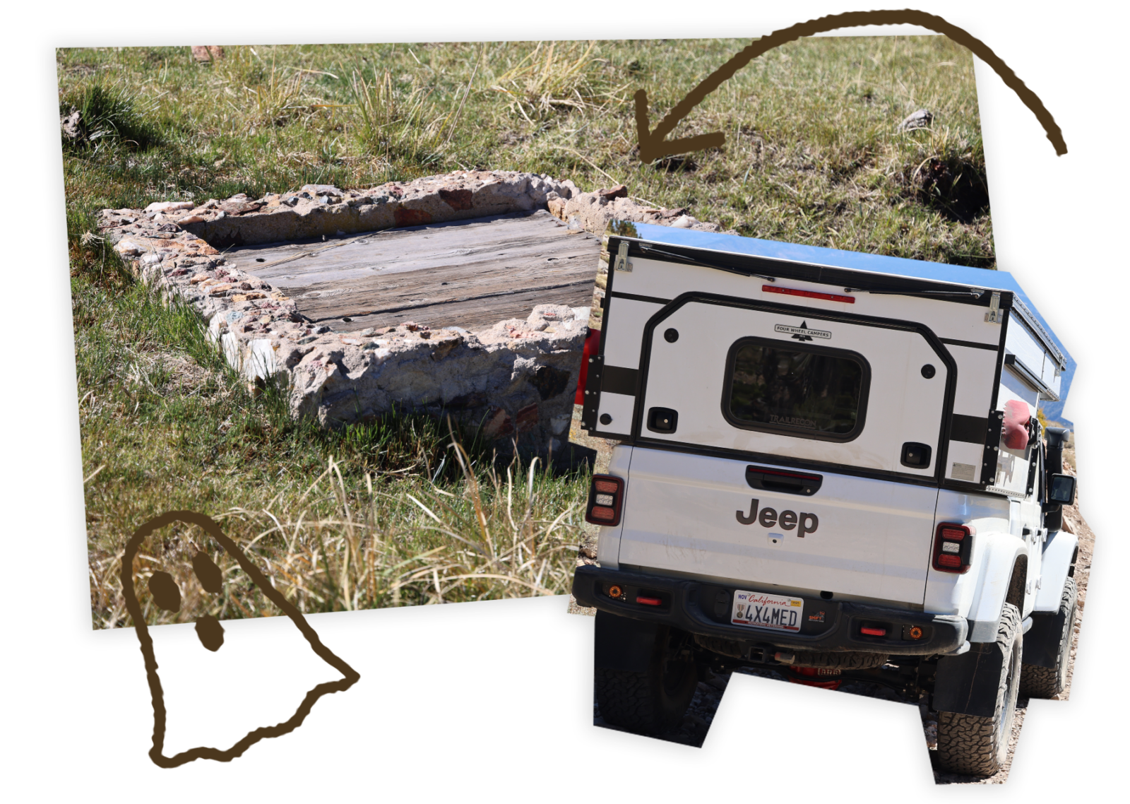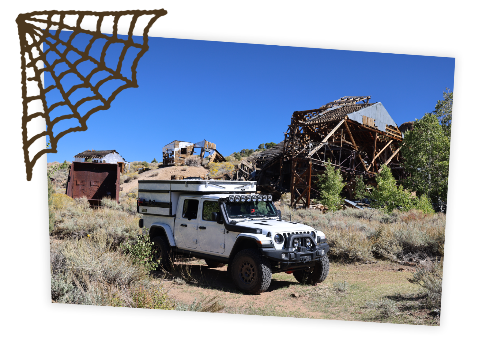 The next morning, I pointed the Gladiator toward Pine Grove, the last ghost town on my route. The drive there was smoother, until it wasn’t, winding through alpine meadows and tight pine trees. I encountered a few more ruts and rocks than I expected, nothing crazy hard, but enough to keep things interesting and the payoff was worth it. Pine Grove is one of those places where history feels tangible. Dozens of structures remain, including cabins, a stamp mill, and what looks like the remains of a saloon. Walking through the ruins, I thought about the determination it must have taken to live and work out here in the late 1800s. No roads, no supply chains, just grit and hope.