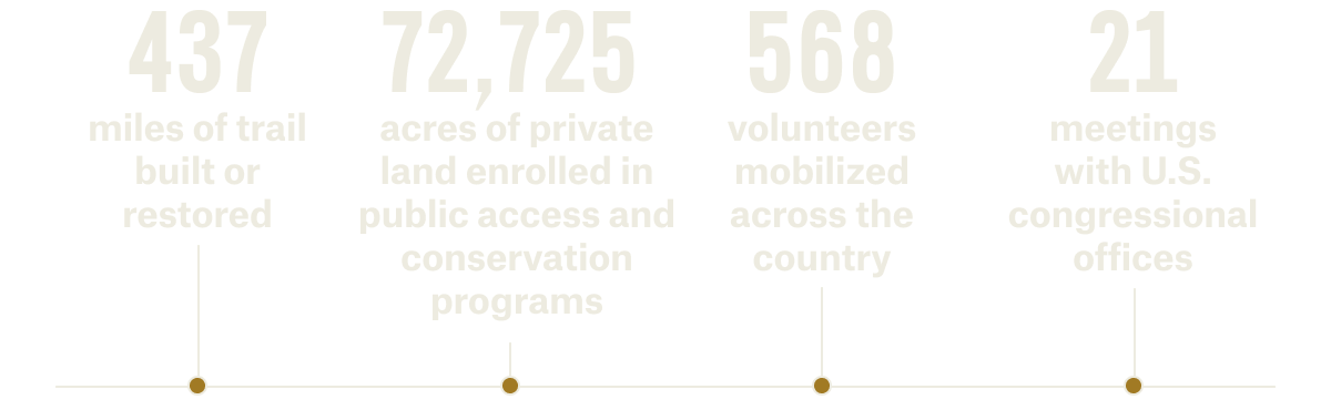 In 2025, our Access and Stewardship work spanned landscapes, recreation types, and communities nationwide. From trail restoration to policy advocacy, these figures offer only a narrow glimpse of the broad spectrum of stories in our Impact Report. Dive deeper for the complete picture.
