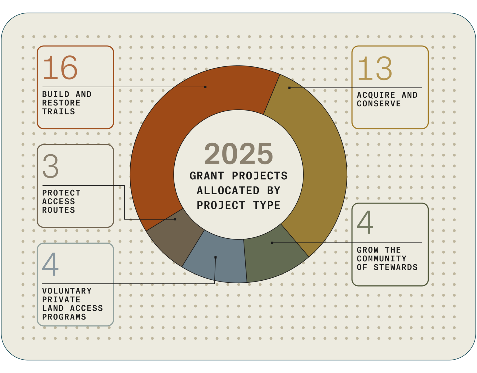 From rural trail systems to high-use recreation corridors, our Adventure Forever Grants supported projects in 23 states this year. Each point on the map represents a local solution shaped by the people who know those places best. This chart shows how many projects of each type we supported in 2025.